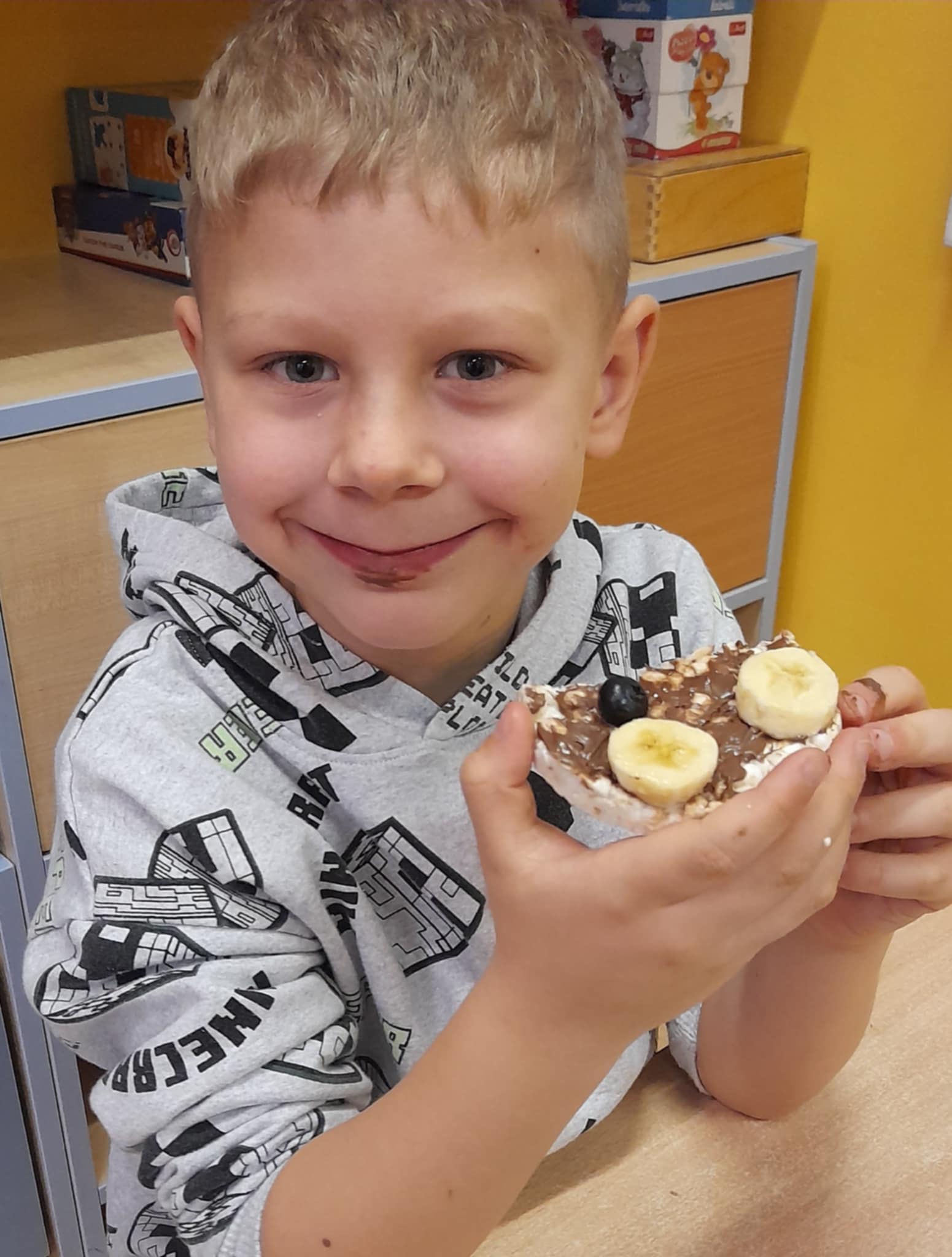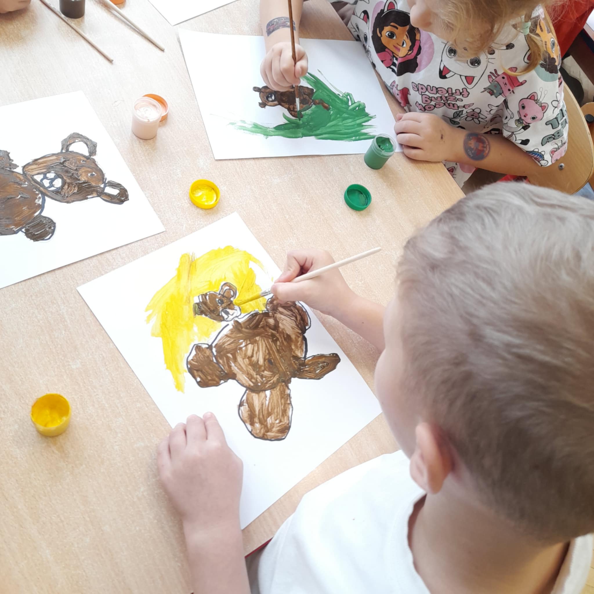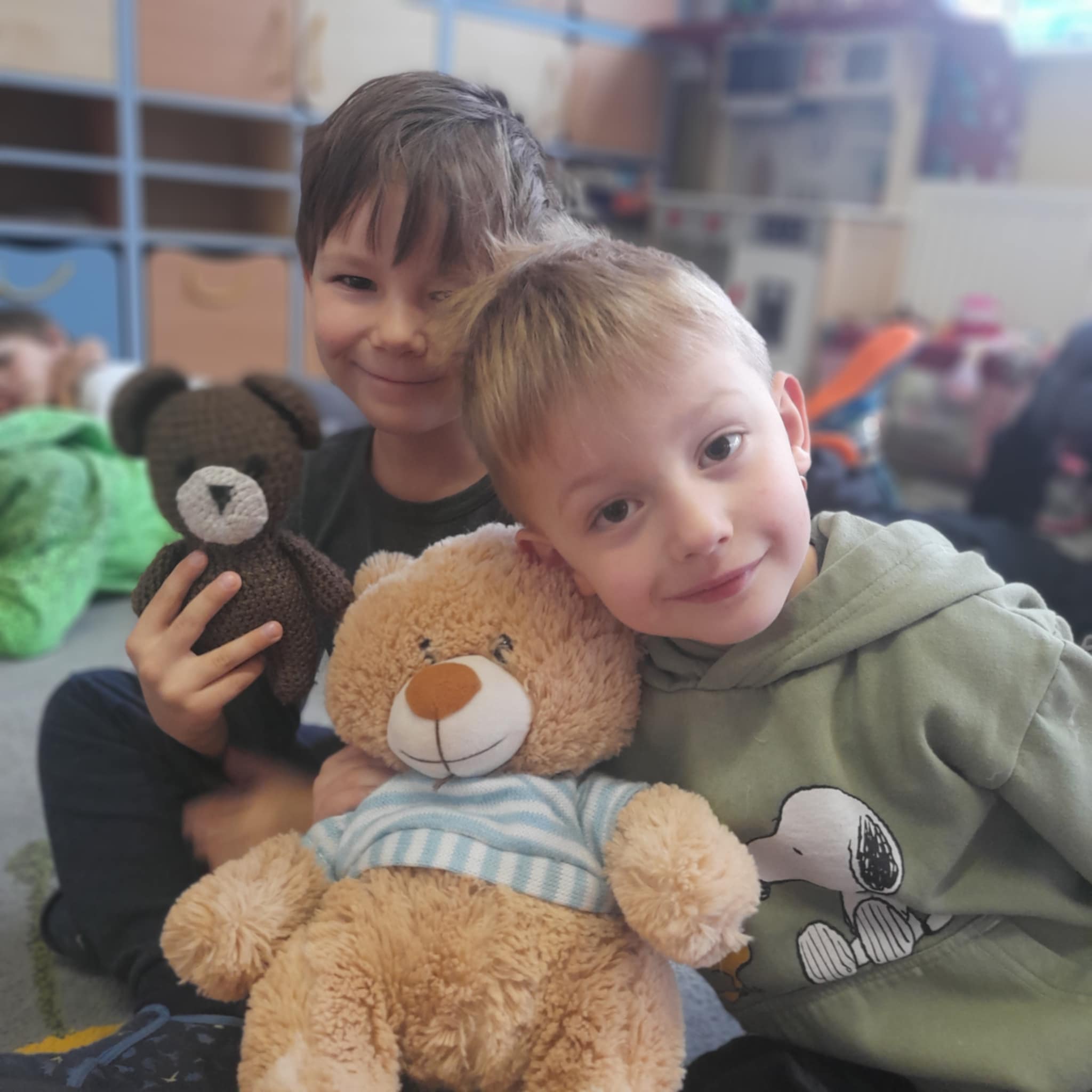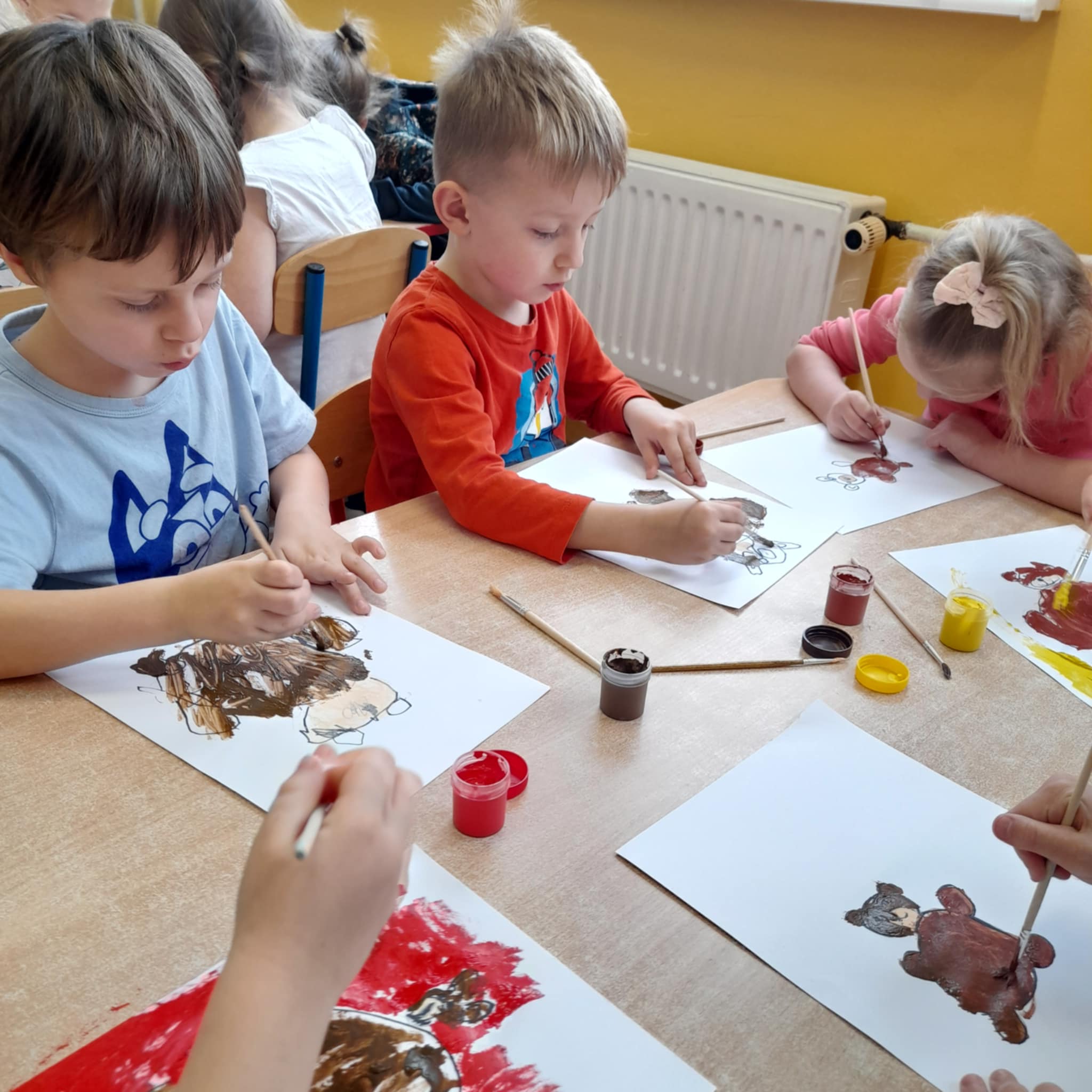 W grupie Biedronek świętowaliśmy wyjątkowy dzień – Dzień Pluszowego Misia! Od rana w sali panowała radosna atmosfera, a dzieci z entuzjazmem uczestniczyły w przygotowanych aktywnościach. Najpierw każdy przedszkolak mógł wykazać się kreatywnością, malując misie farbami. Powstały kolorowe, wesołe prace pełne dziecięcej wyobraźni. Następnie wspólnie tworzyliśmy książeczkę o misiach, w której Biedronki opowiadały, rysowały i wymyślały własne misiowe historie. Dużo radości sprawiło też kolorowanie sweterków z misiami, co pozwoliło dzieciom poćwiczyć spostrzegawczość i dobór barw. Jednak największą atrakcją okazały się jadalne misie z wafli ryżowych, nutelli, bananów i borówek. Dzieci z ogromnym zaangażowaniem ozdabiały swoje „misiowe buźki”, a później z apetytem je zajadały. Na zakończenie dnia Biedronki nauczyły się nowej piosenki o misiu, którą z dumą zaprezentowały podczas zajęć. To był dzień pełen uśmiechu, zabawy i misiowej magii – dokładnie taki, jaki lubią nasze Biedronki!