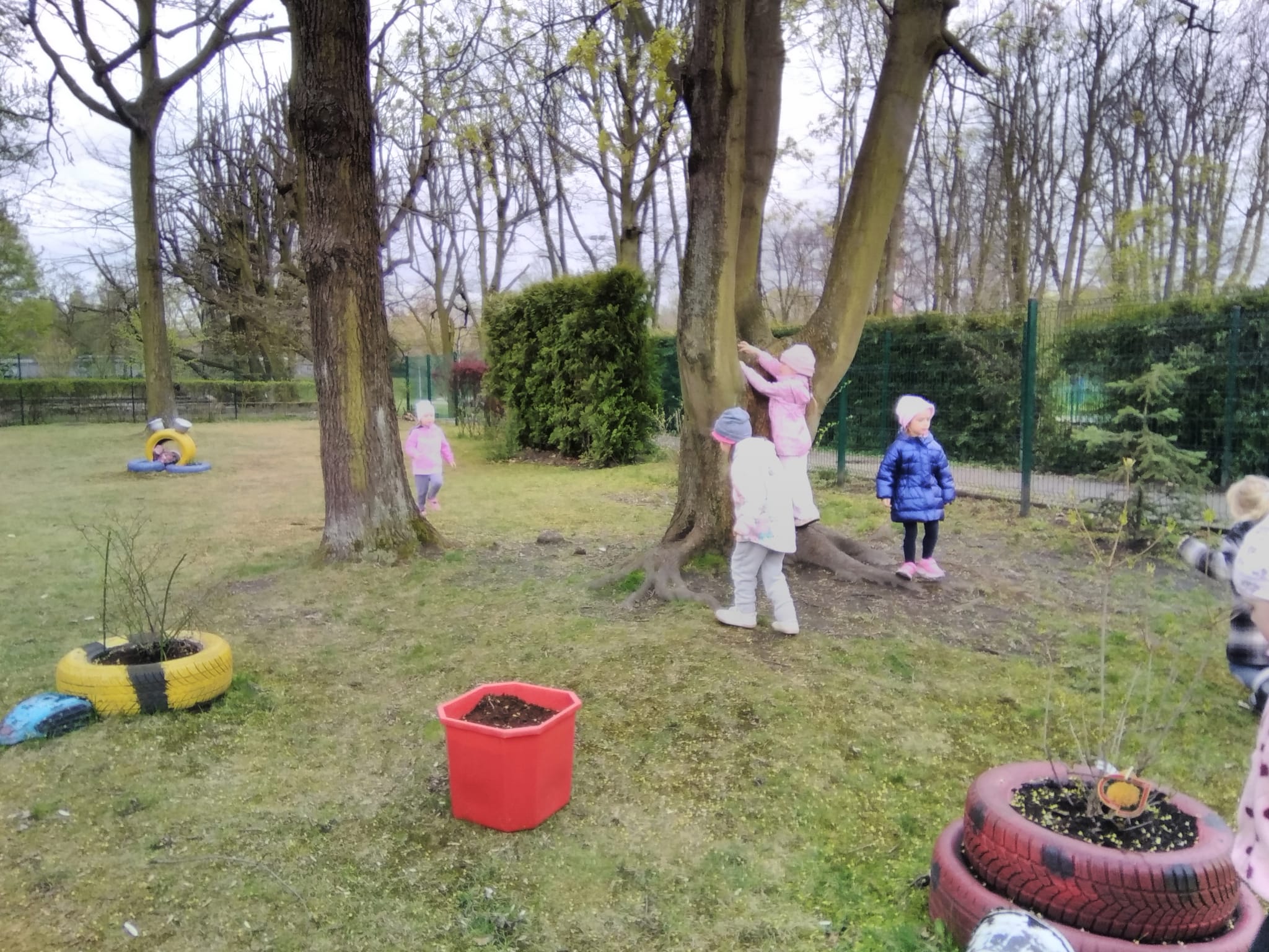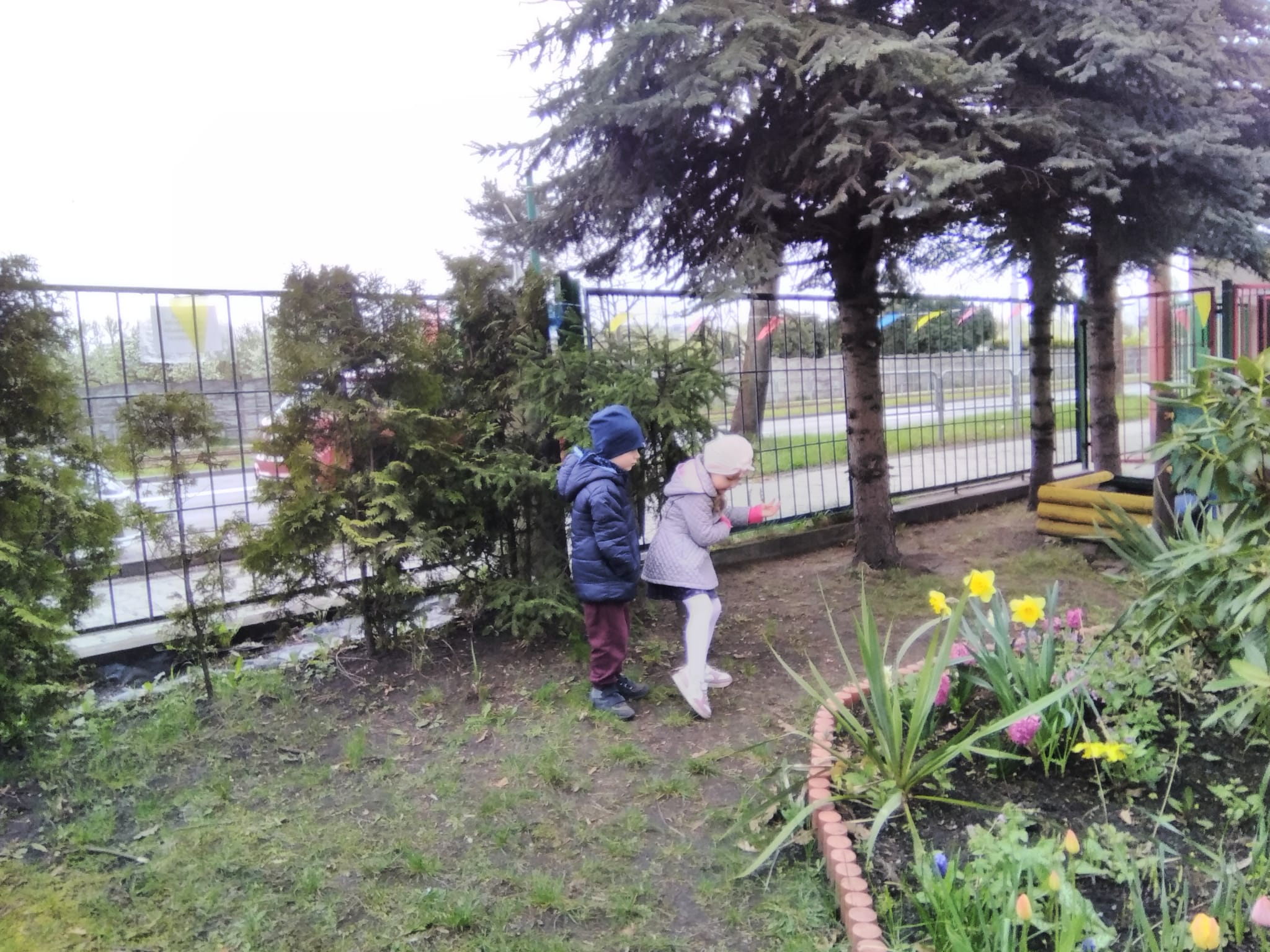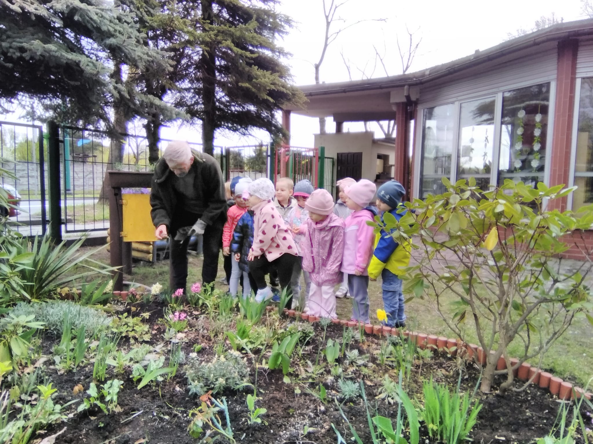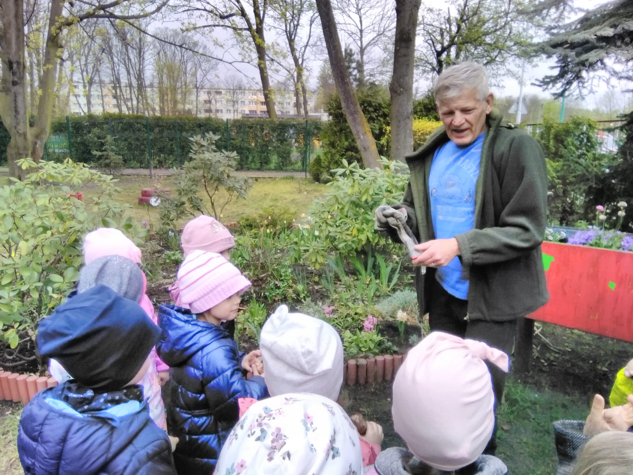 Żabki w ogrodzie wiosny szukają.Cebulki kwiatów w ziemię wkładają, świat małych zwierząt obserwują i z Panem Jarkiem dyskutują.Codziennie sprawdzają,jak zmienia się nasz ogród i jego mieszkańcy.