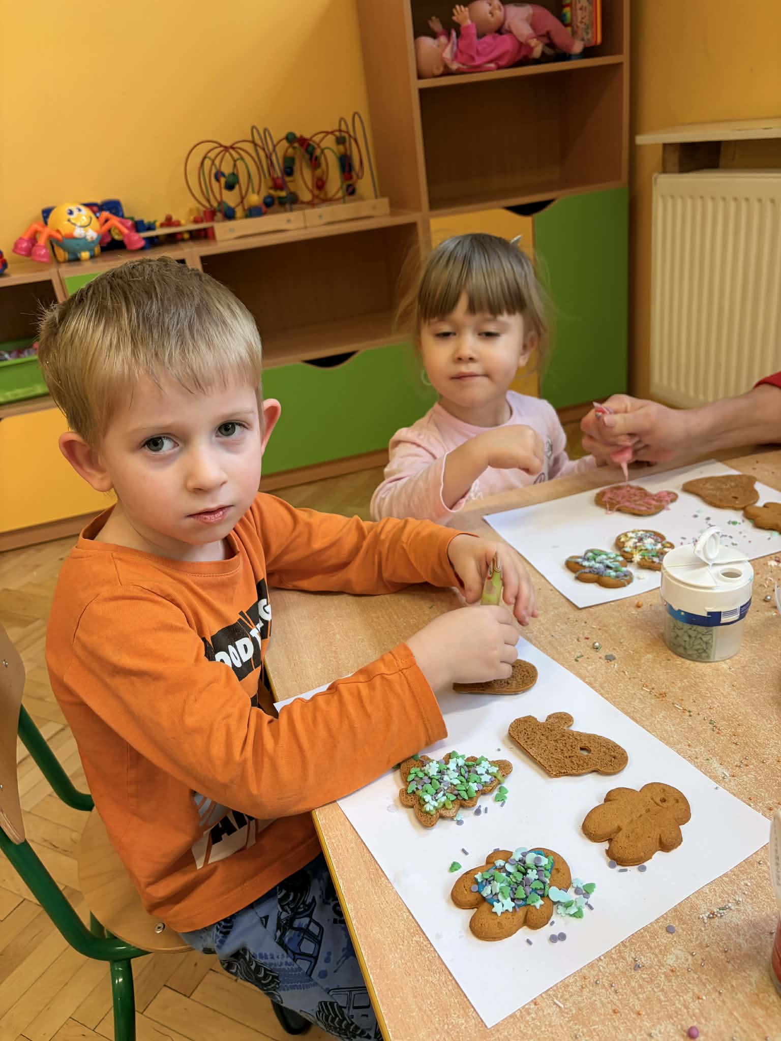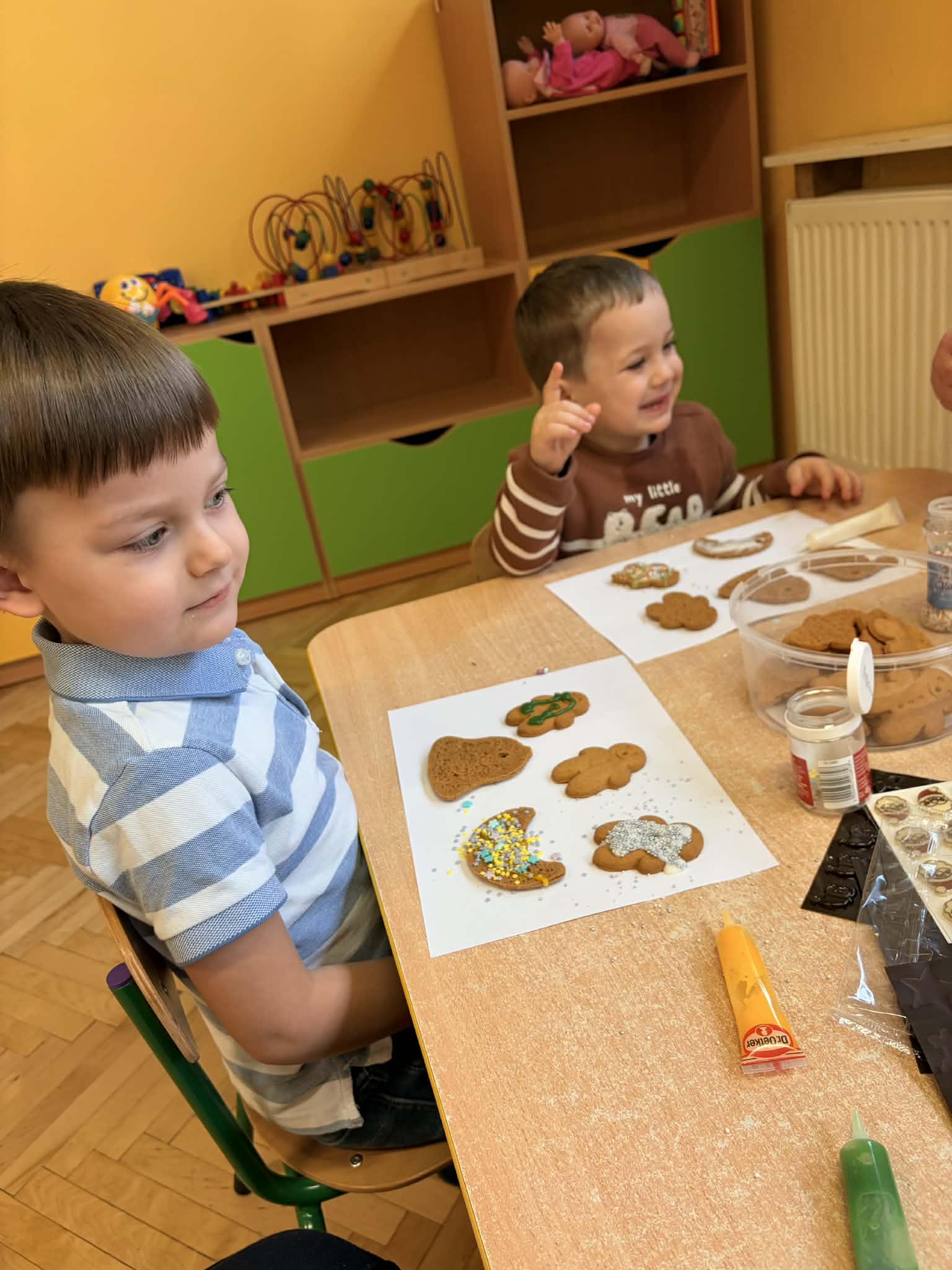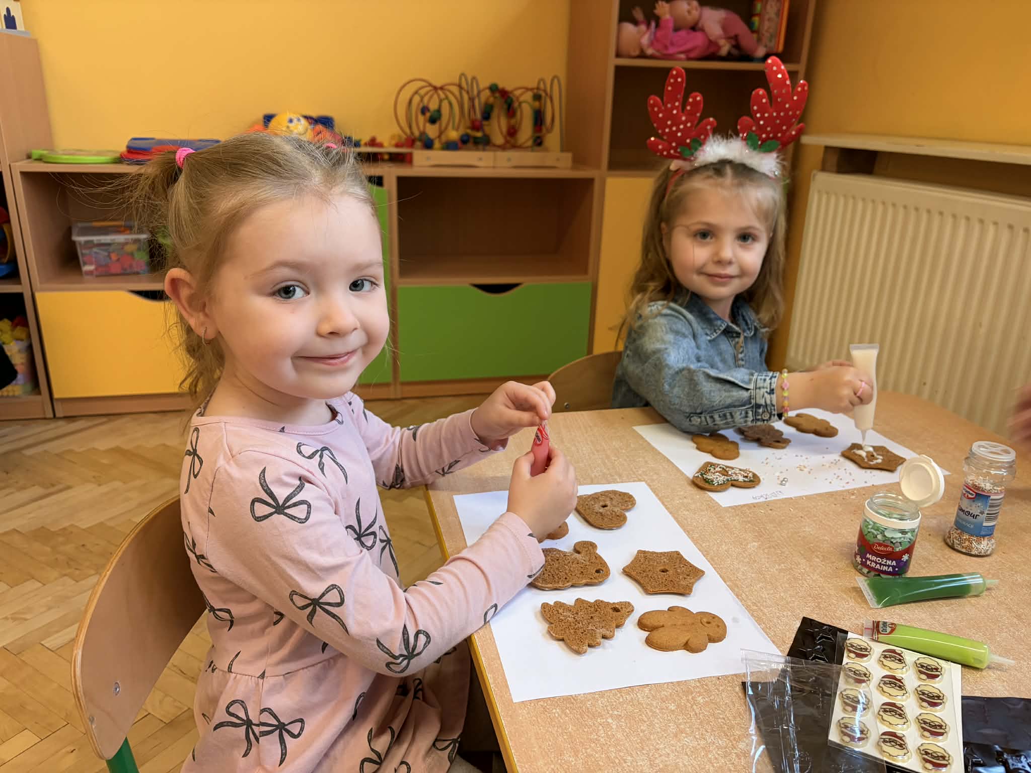 Dzieci z grupy „Maluszki" z wielką radością dekorowały świąteczne ciasteczka, wykorzystując ozdoby przyniesione z domu. Powstały piękne, kolorowe i bardzo pomysłowe wypieki, które wprowadziły wszystkich w świąteczny nastrój. Serdecznie dziękuję Rodzicom za przygotowanie i przyniesienie ozdób oraz pisaków, dzięki którym dzieci mogły twórczo i radośnie spędzić ten czas. Z okazji Świąt Bożego Narodzenia życzę Państwu chwil pełnych ciszy i wzruszeń, czasu zatrzymanego przy blasku choinkowych świateł, radości płynącej z dziecięcych uśmiechów oraz spokoju, który zostaje w sercu na długo - Pani Monika B.