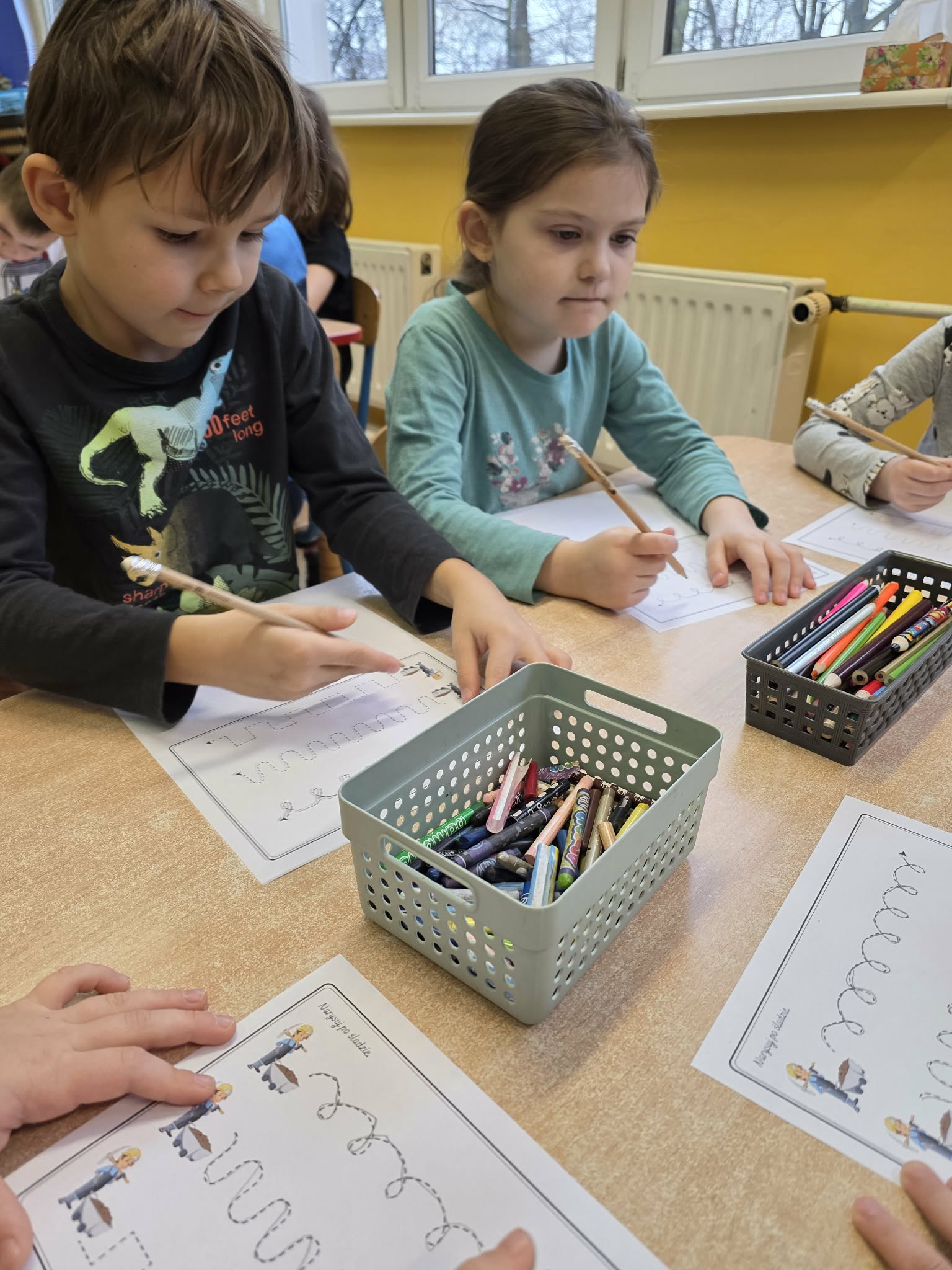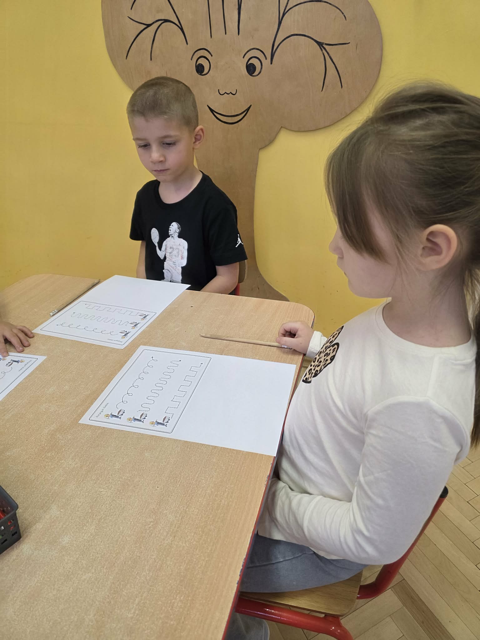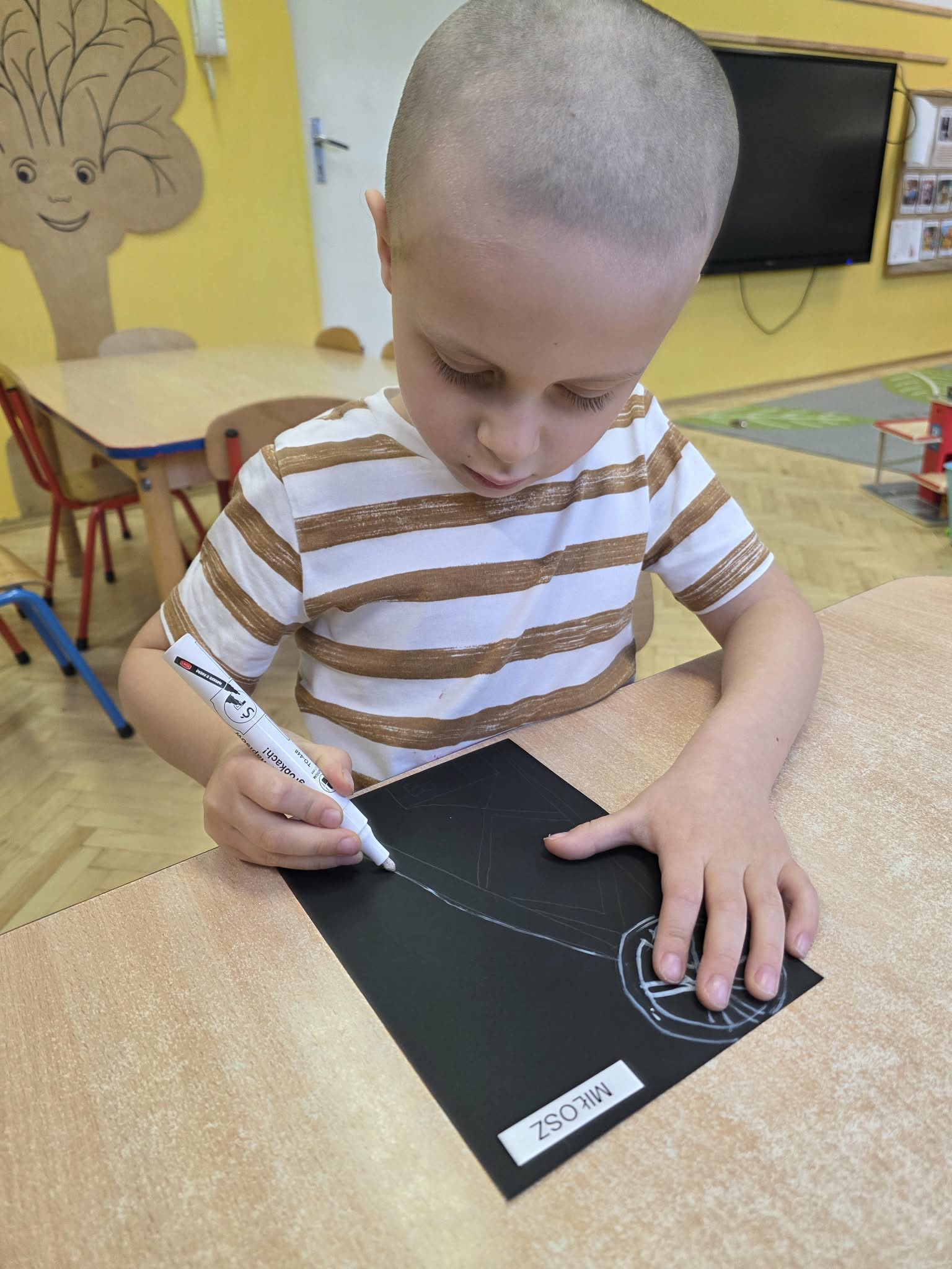 Zbliżający się Dzień Górnika stał się doskonałą okazją w grupie Biedronki do poznania pracy górników oraz tradycji związanych z tym świętem. W ostatnich dniach nasze przedszkolaki brały udział w tematycznych zajęciach plastycznych i grafomotorycznych, które pozwoliły im lepiej zrozumieć, jak wygląda praca pod ziemią. Dzieci wykonały wyjątkowe prace plastyczne – malowały białymi mazakami na czarnych kartkach, tworząc ilustracje przedstawiające kopalnię, górników, lampy, wózki z węglem i inne elementy kojarzone z tym zawodem. Kontrast barw sprawił, że prace wyglądały naprawdę efektownie, a mali artyści byli z nich bardzo dumni. Przedszkolaki rozwijały także swoje umiejętności manualne, wykonując zadania grafomotoryczne o tematyce górniczej. Dzięki nim ćwiczyły precyzję, koordynację wzrokowo–ruchową oraz przygotowywały się do nauki pisania w ciekawy i atrakcyjny sposób. Dzieci z zaangażowaniem uczestniczyły w zajęciach, a atmosfera pełna ciekawości i twórczej energii sprawiła, że przygotowania do Dnia Górnika były dla nich świetną przygodą.
