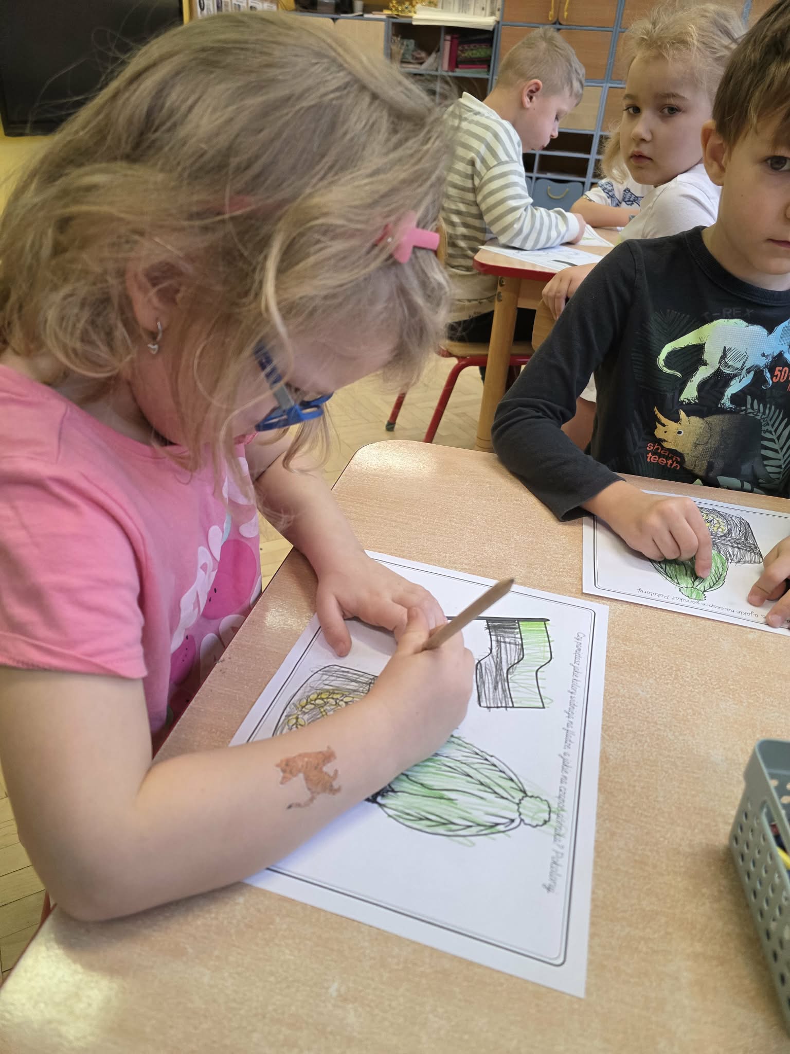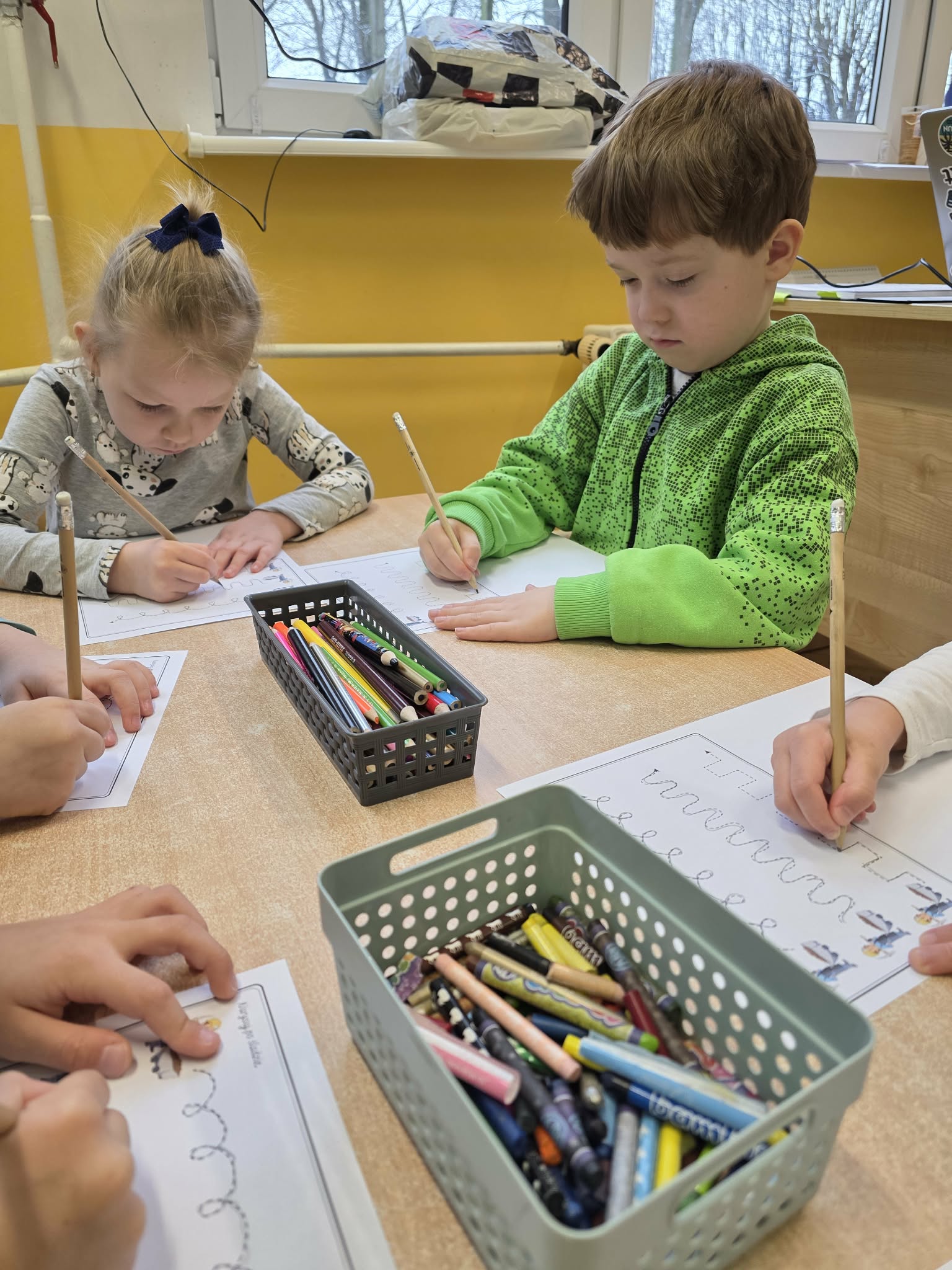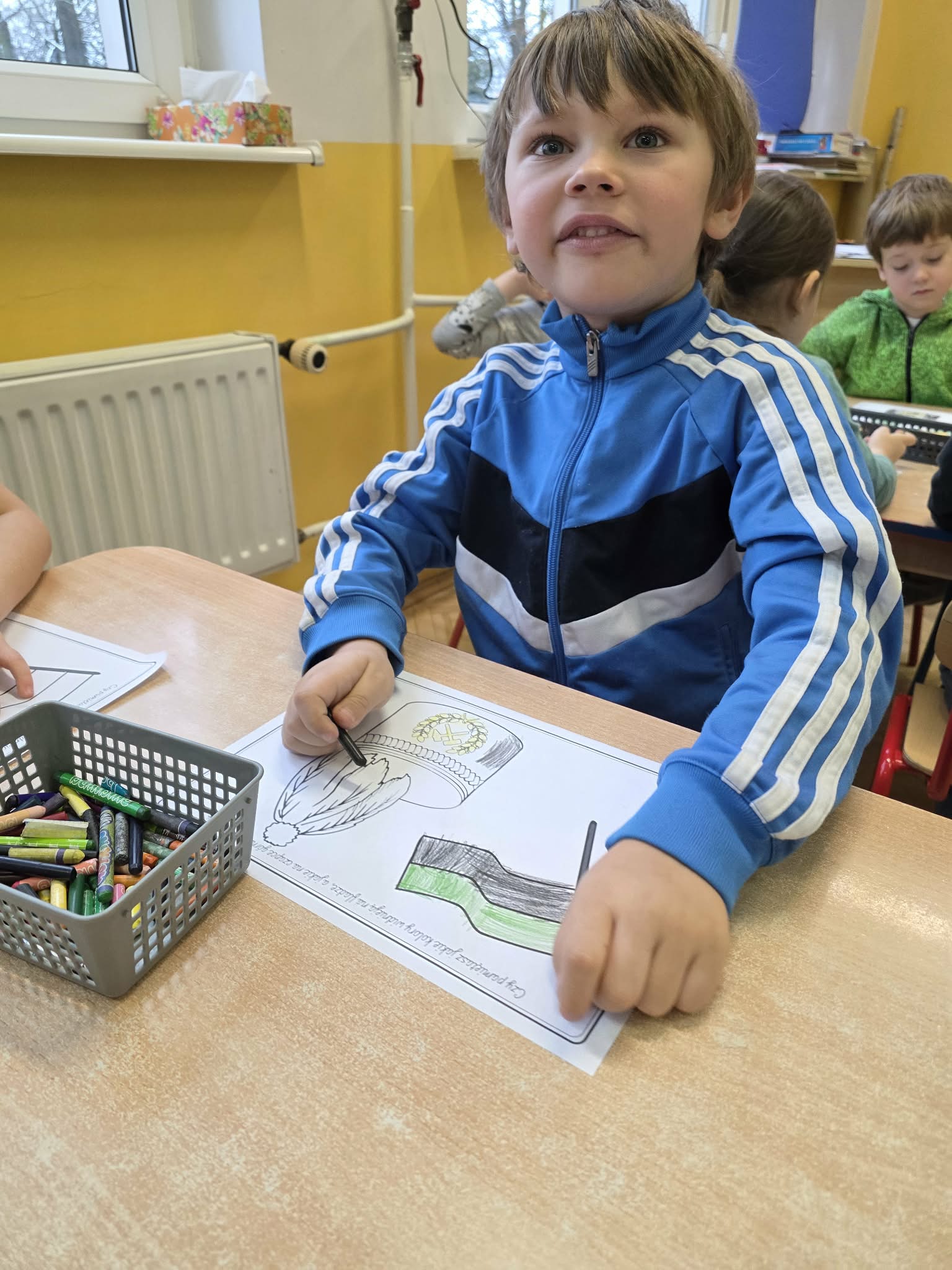 Zbliżający się Dzień Górnika stał się doskonałą okazją w grupie Biedronki do poznania pracy górników oraz tradycji związanych z tym świętem. W ostatnich dniach nasze przedszkolaki brały udział w tematycznych zajęciach plastycznych i grafomotorycznych, które pozwoliły im lepiej zrozumieć, jak wygląda praca pod ziemią. Dzieci wykonały wyjątkowe prace plastyczne – malowały białymi mazakami na czarnych kartkach, tworząc ilustracje przedstawiające kopalnię, górników, lampy, wózki z węglem i inne elementy kojarzone z tym zawodem. Kontrast barw sprawił, że prace wyglądały naprawdę efektownie, a mali artyści byli z nich bardzo dumni. Przedszkolaki rozwijały także swoje umiejętności manualne, wykonując zadania grafomotoryczne o tematyce górniczej. Dzięki nim ćwiczyły precyzję, koordynację wzrokowo–ruchową oraz przygotowywały się do nauki pisania w ciekawy i atrakcyjny sposób. Dzieci z zaangażowaniem uczestniczyły w zajęciach, a atmosfera pełna ciekawości i twórczej energii sprawiła, że przygotowania do Dnia Górnika były dla nich świetną przygodą.