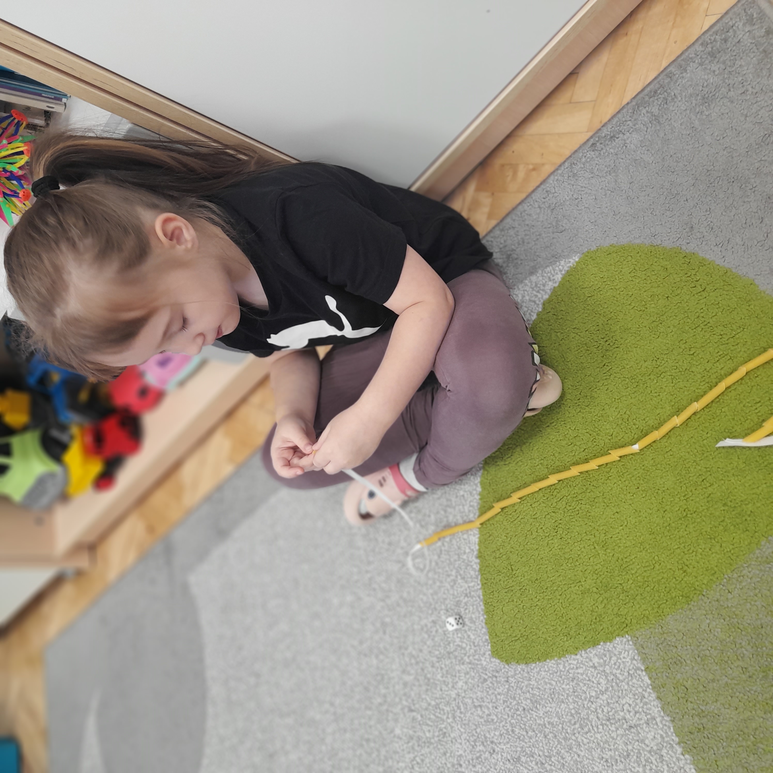 Nasza zabawa makaronowo-matematyczna polega na tym, aby nawlec na sznurek tyle makaronów, ile wskazuje liczba oczek na kostce. Dodatkowo, ćwiczy koncentrację i skupienie uwagi oraz rozwija sprawność dłoni i palców niezbędną do podjęcia nauki w szkole podstawowej.
