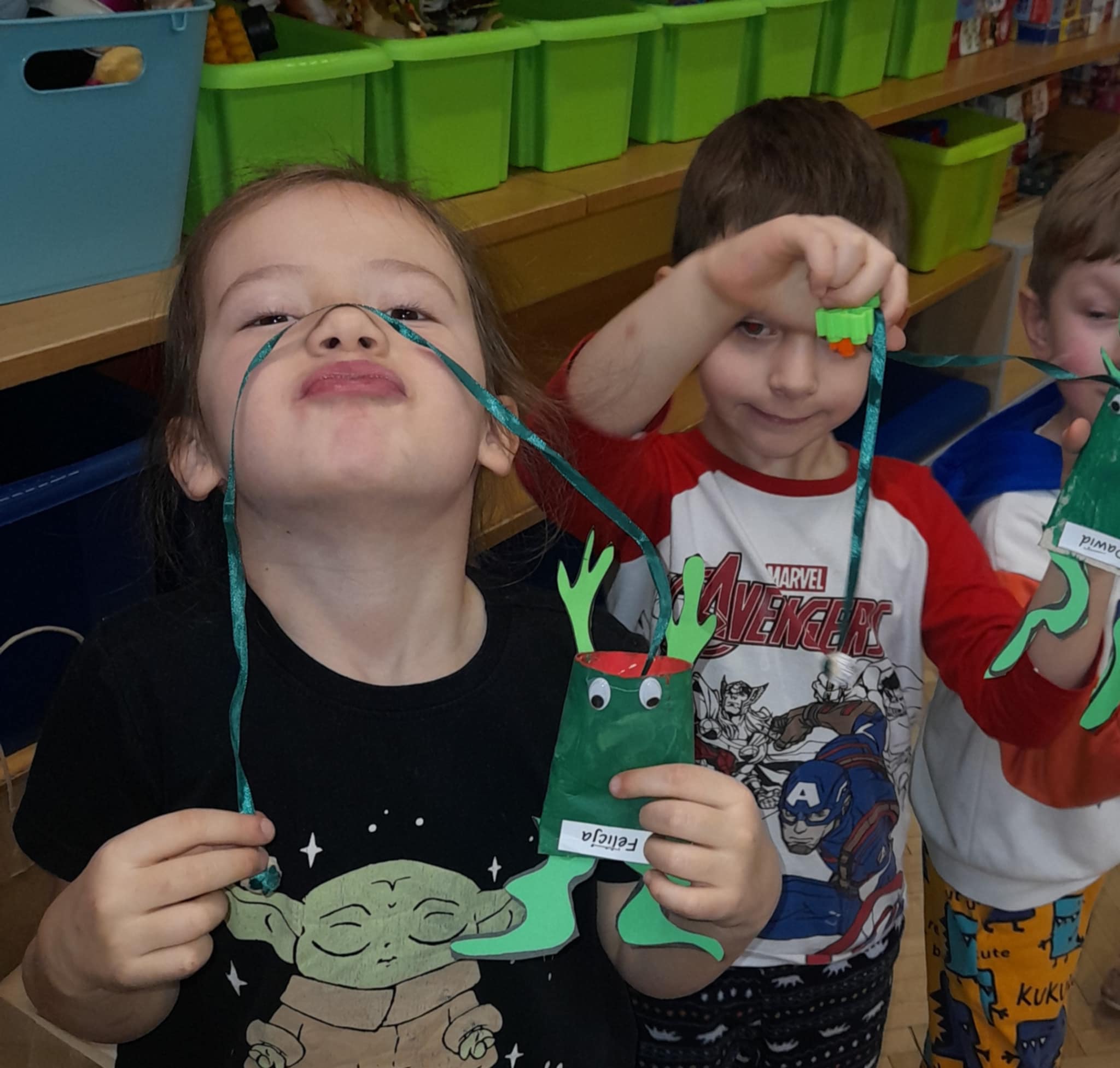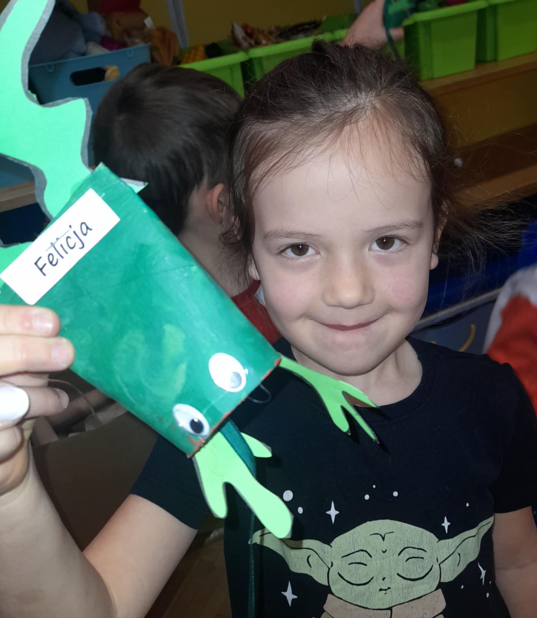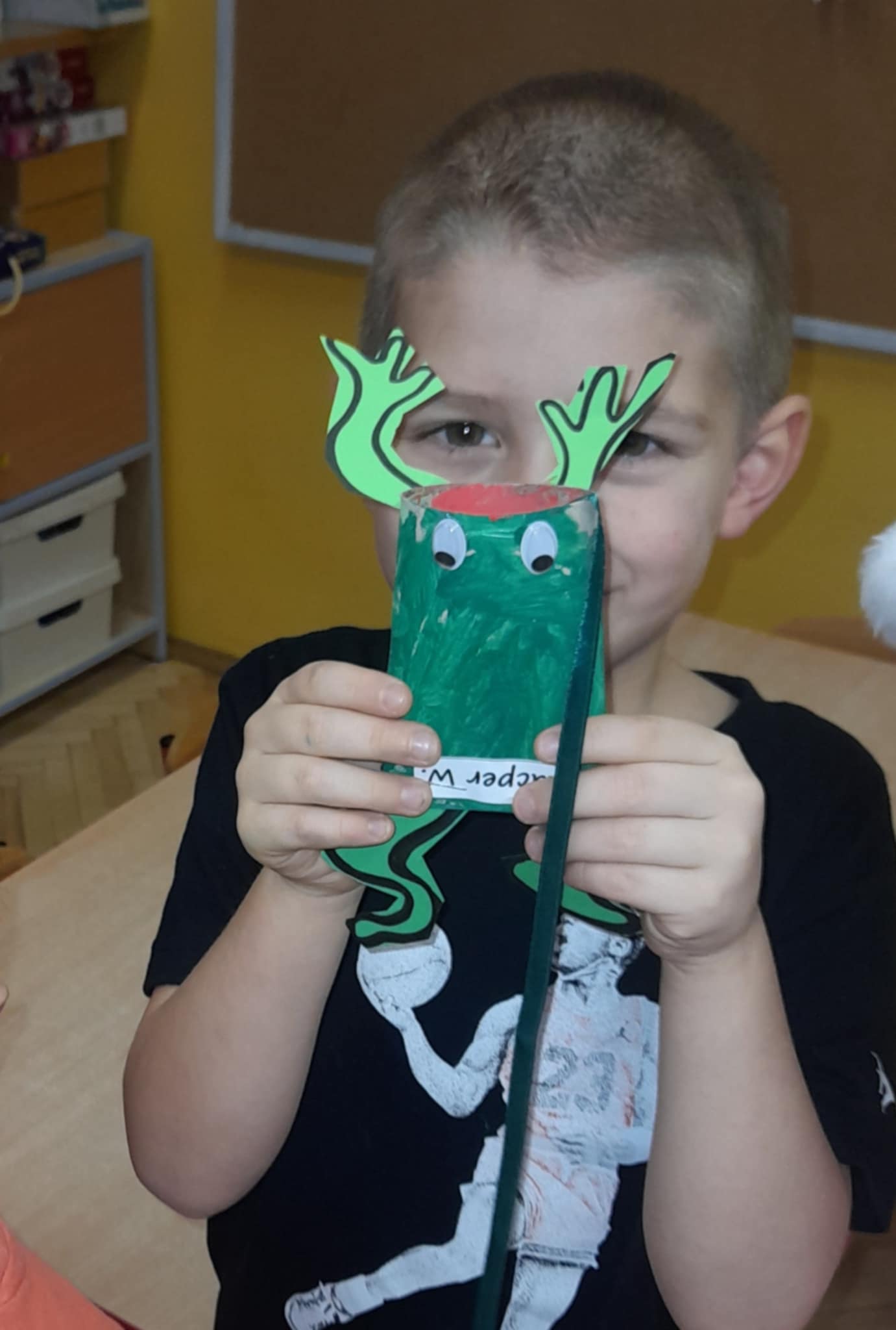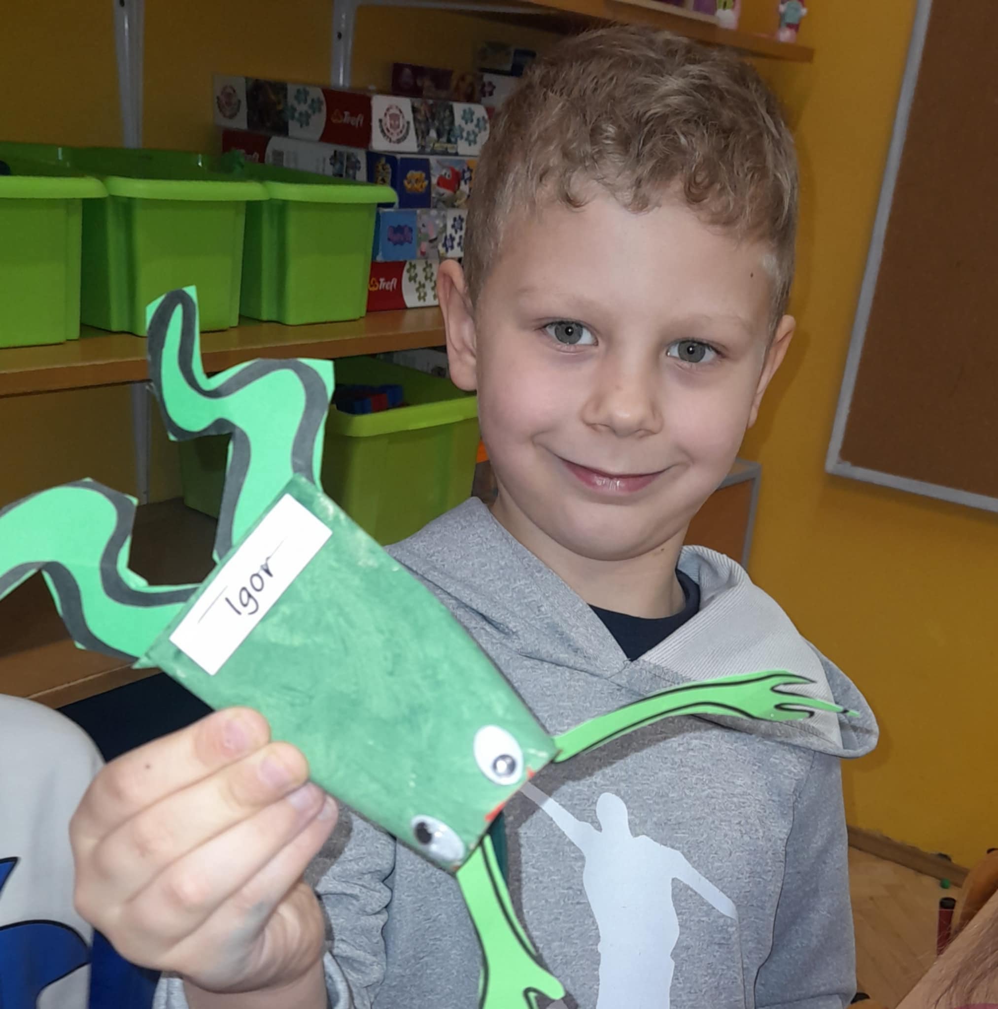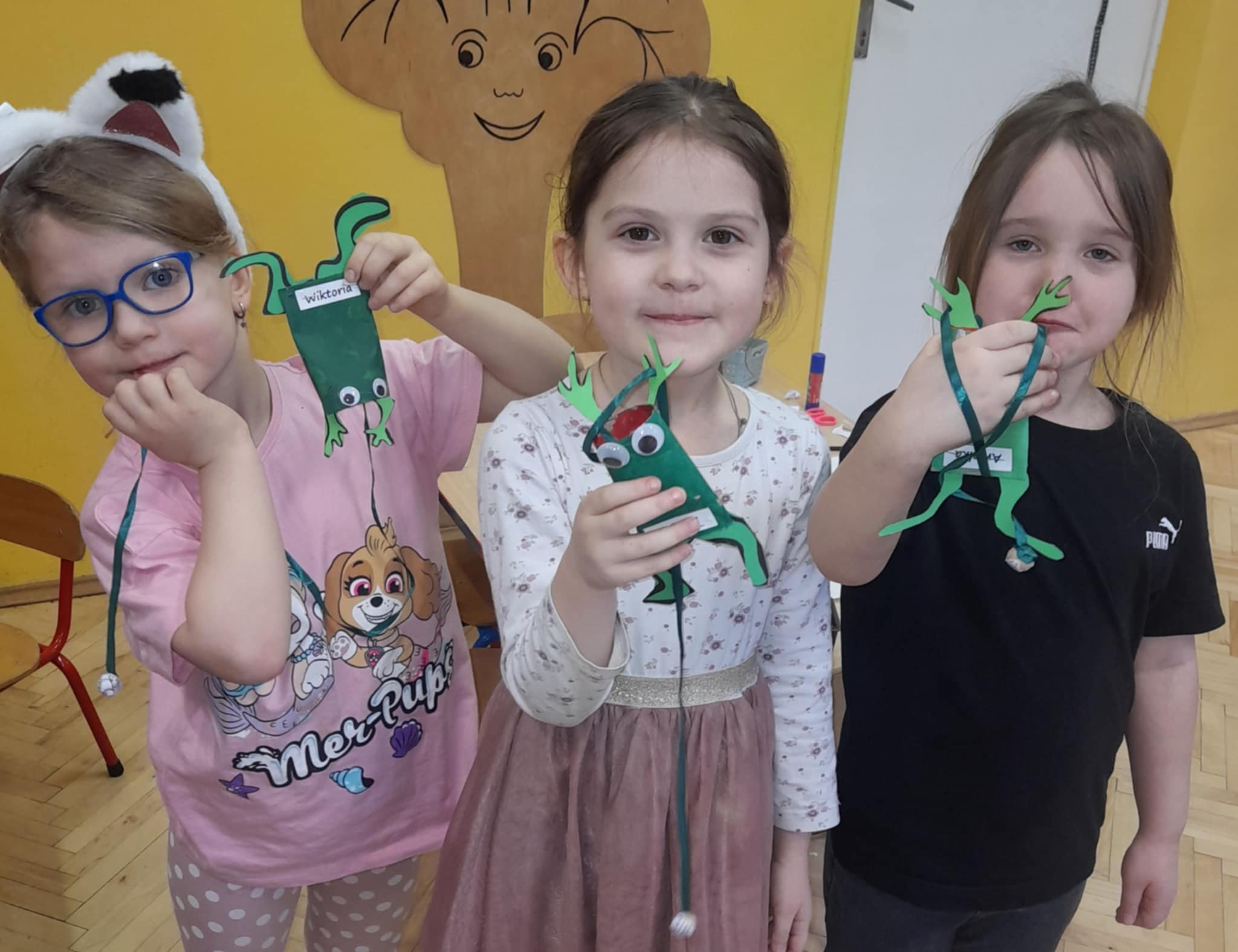 Zaprojektowaliśmy zabawkę, która ćwiczy spryt, koordynację ruchową oraz naszą cierpliwość... Zadaniem każdego dziecka było nakarmienie żabki - probując wrzucić muchę do środka, używajac tylko jednej ręki! Ależ to byla frajda! A okrzyki "Huraaaa, udało się!" roznosiły się w całym budynku przedszkola!