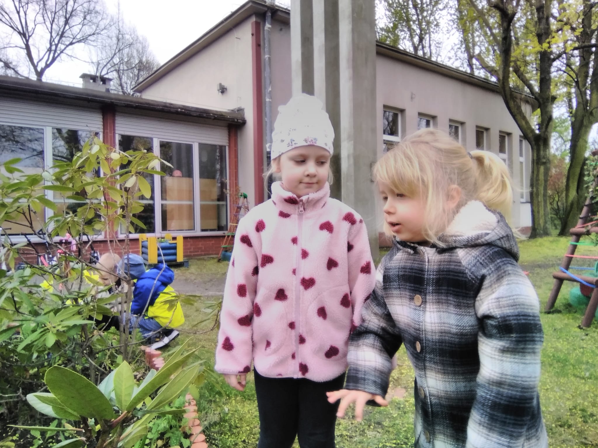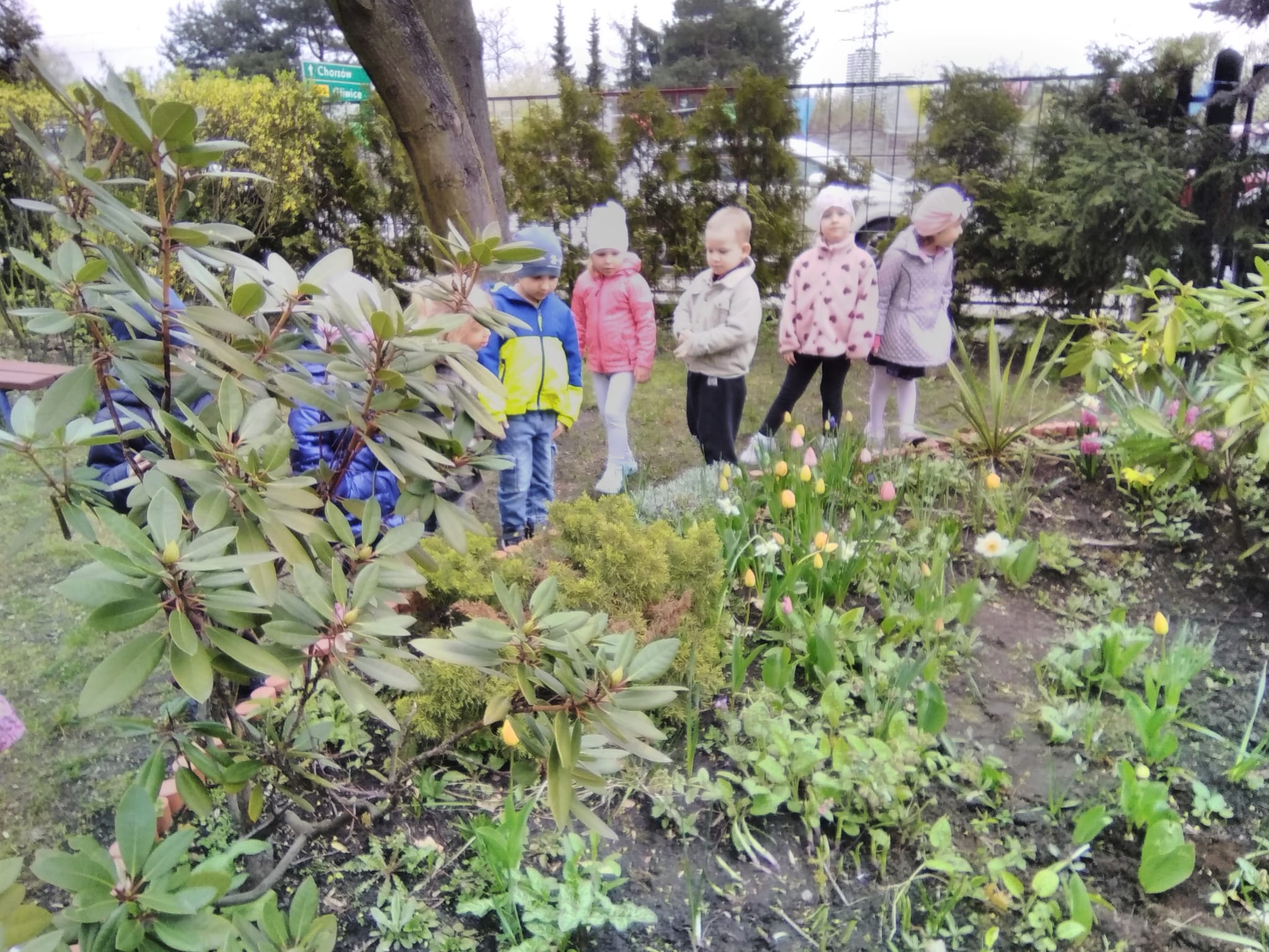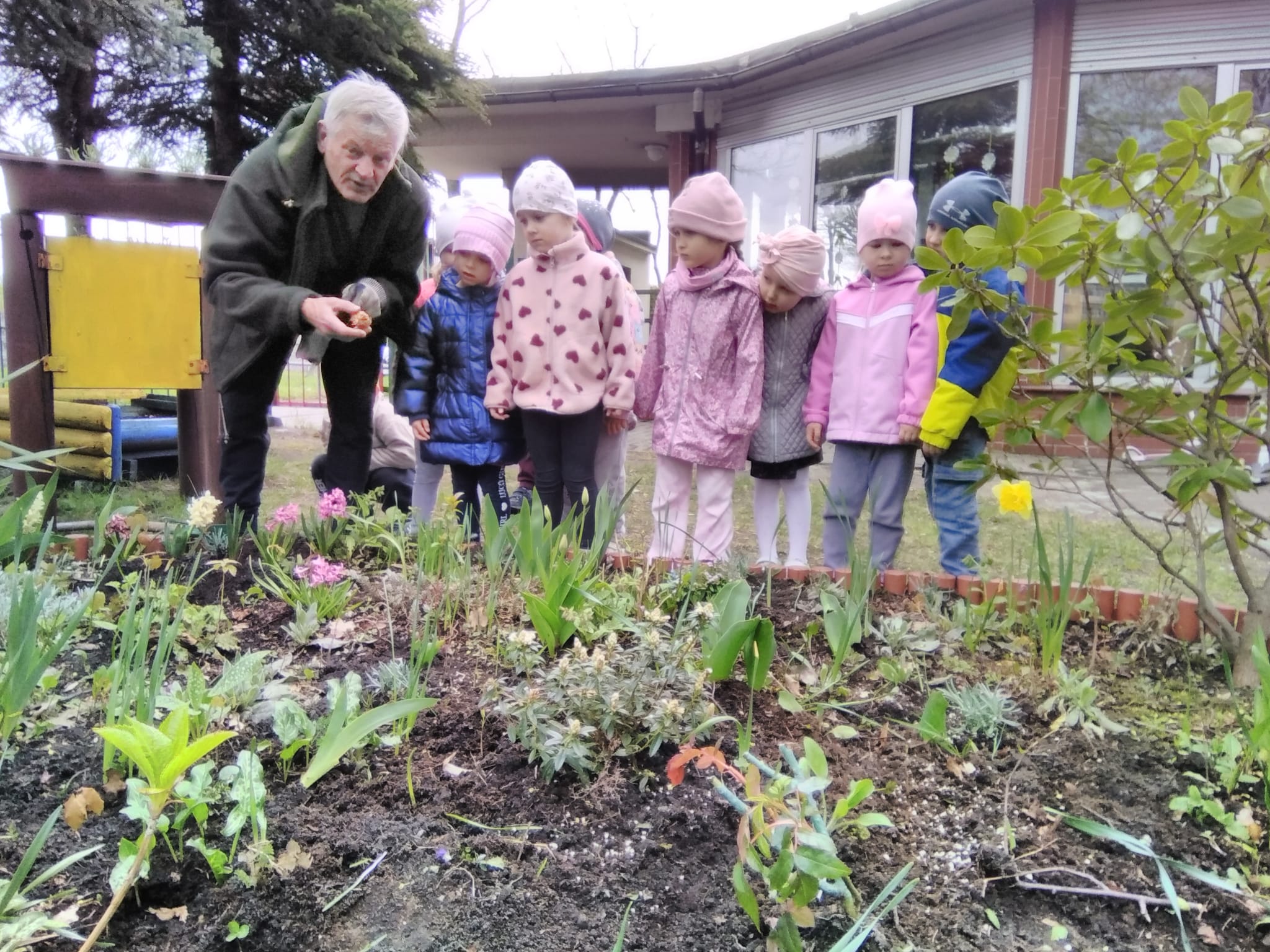Żabki w ogrodzie wiosny szukają.Cebulki kwiatów w ziemię wkładają, świat małych zwierząt obserwują i z Panem Jarkiem dyskutują.Codziennie sprawdzają,jak zmienia się nasz ogród i jego mieszkańcy.