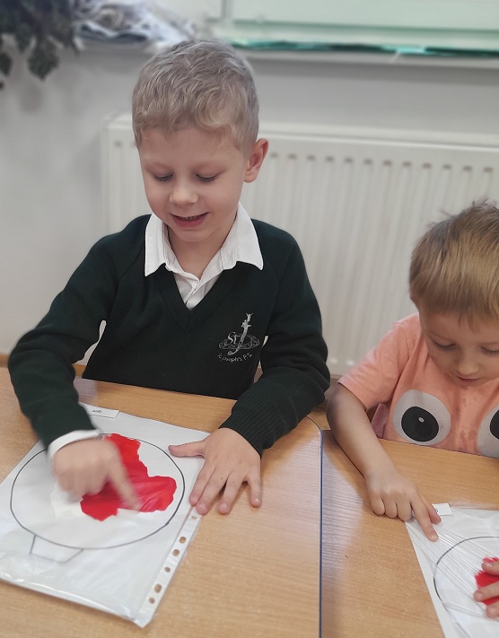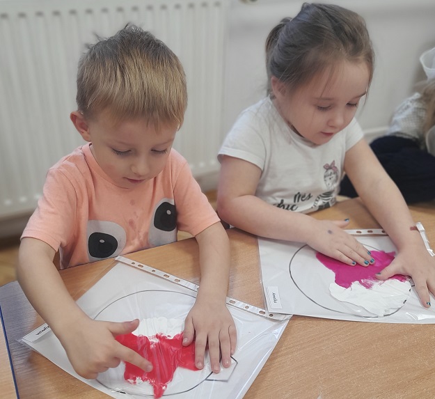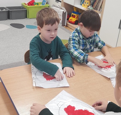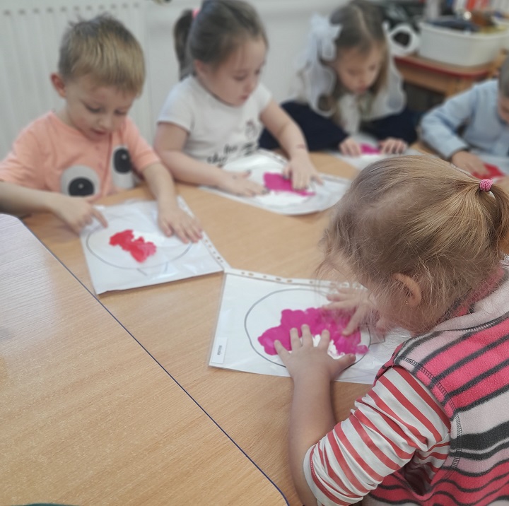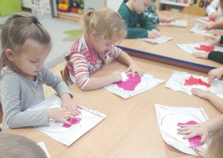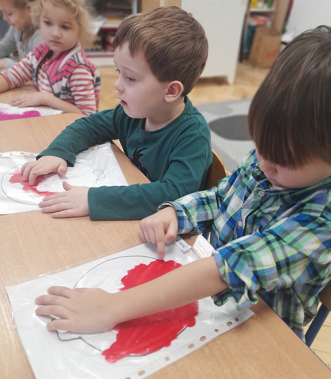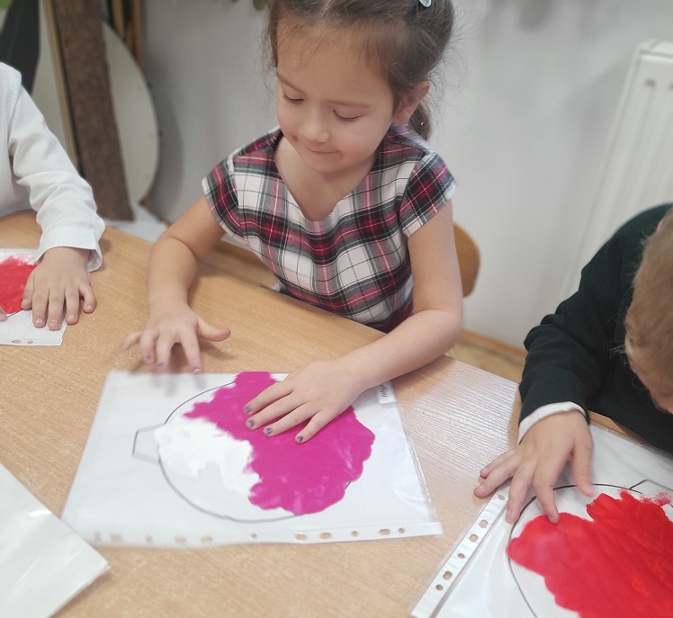 Zabawa polegała na rozcieraniu paluszkami farbki, która została umieszczona w szczelnie zamkniętym woreczku, tworząc kontur świątecznej bombki. Poza świetną zabawą, ćwiczyliśmy również sprawność dłoni i palców oraz koncentrację i skupienie uwagi.