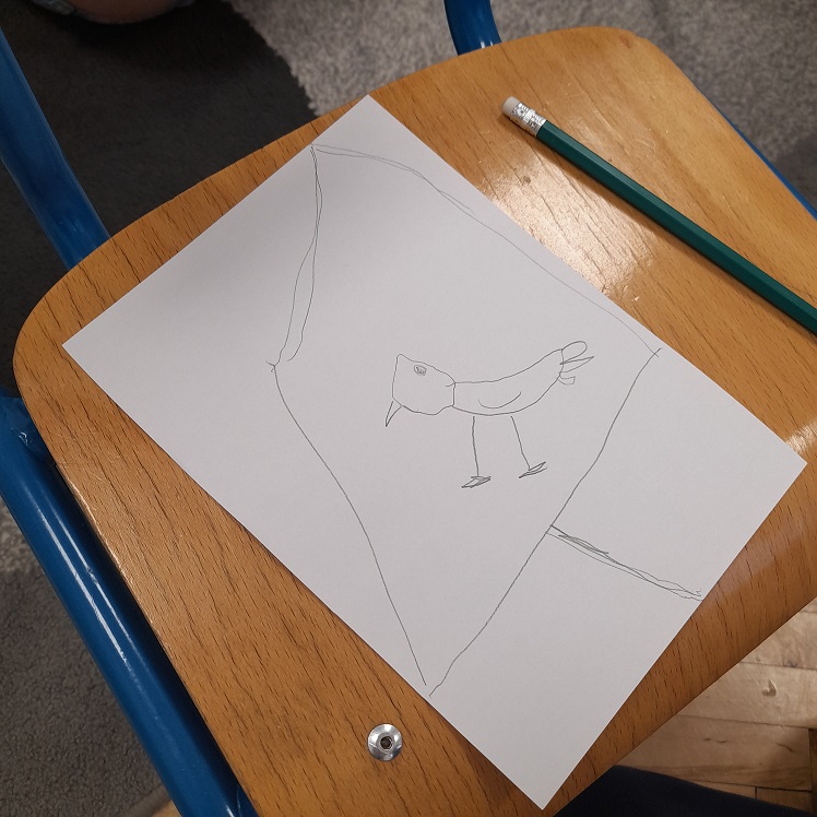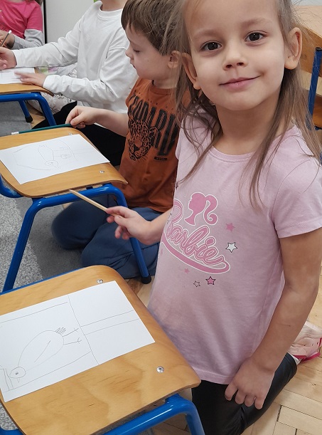 Rysujemy ptaszka zgodnie z treścią wiersza, dorysowujemy karmnik.