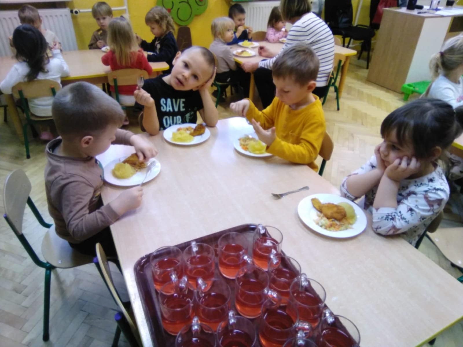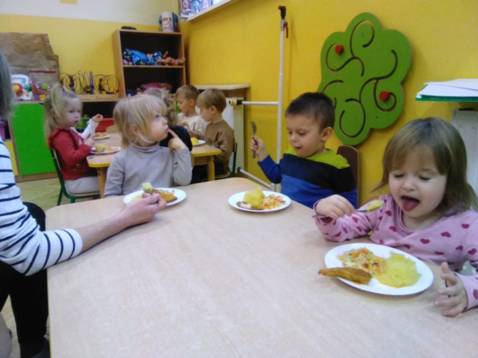 Smakują nam obiadki, mniam. Zjadam je sama, zjadam je sam.