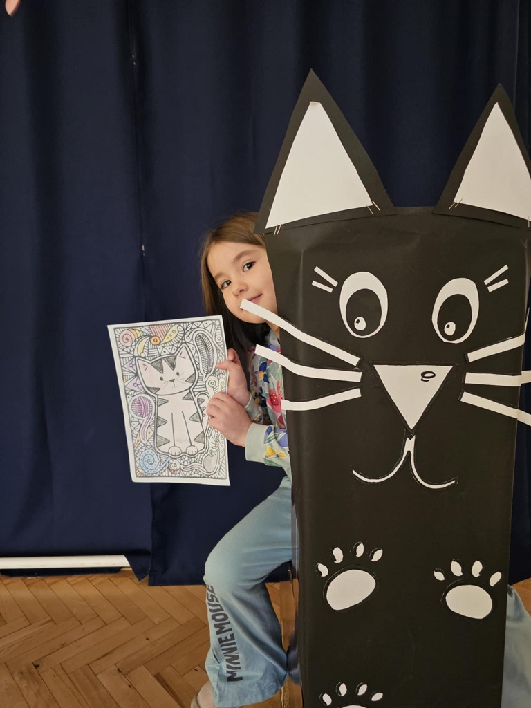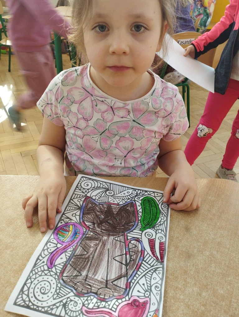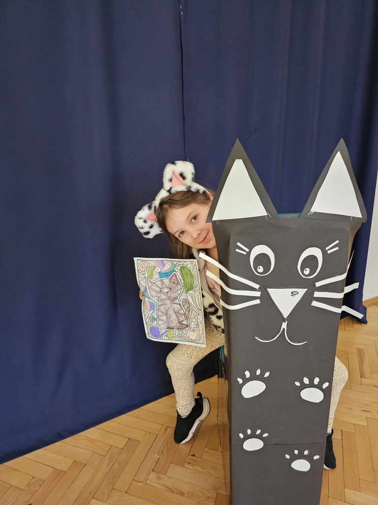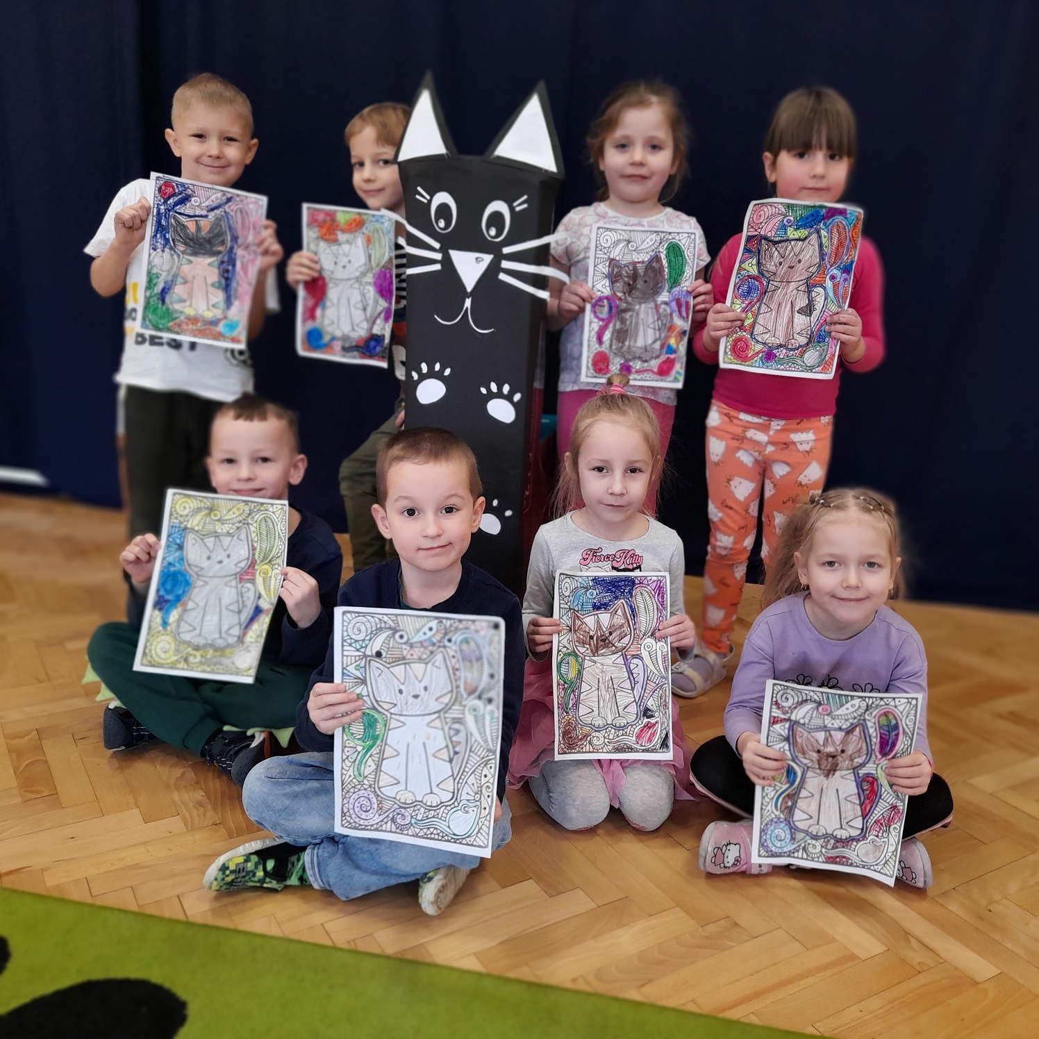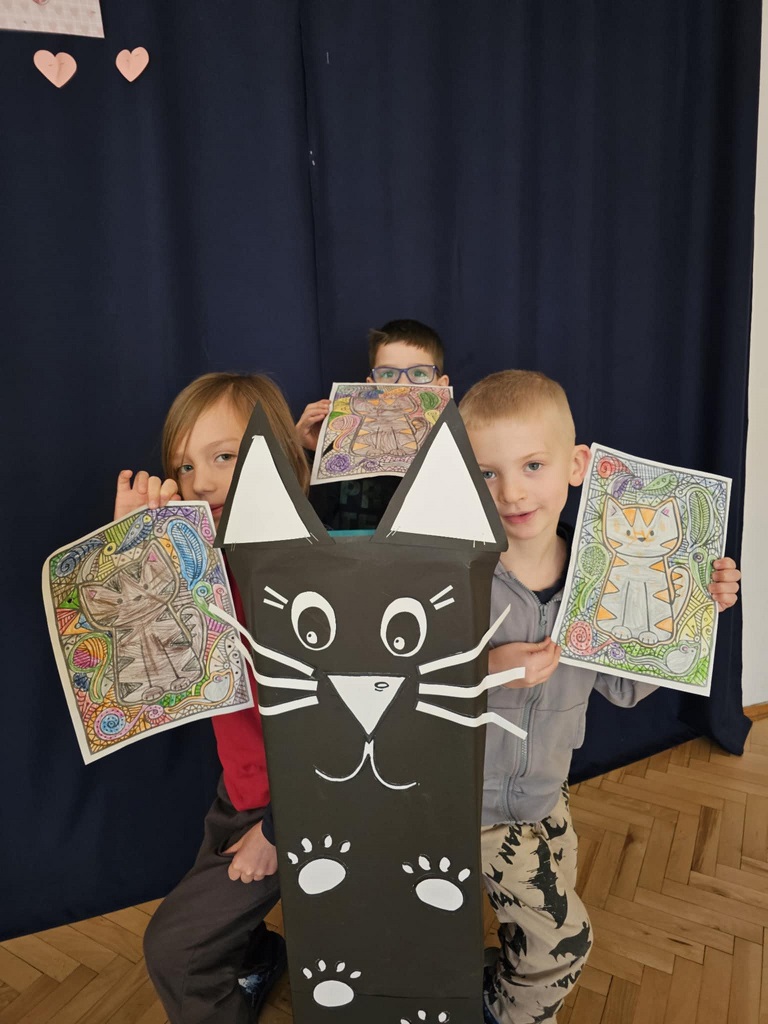 Dzieci miały dzisiaj możliwość opowiedzenia nam o swoich pupilach czyli kotach, które mają w domu. Wykonaliśmy ich podobizny, jak również bawiliśmy się z naszym kotem z papieru.