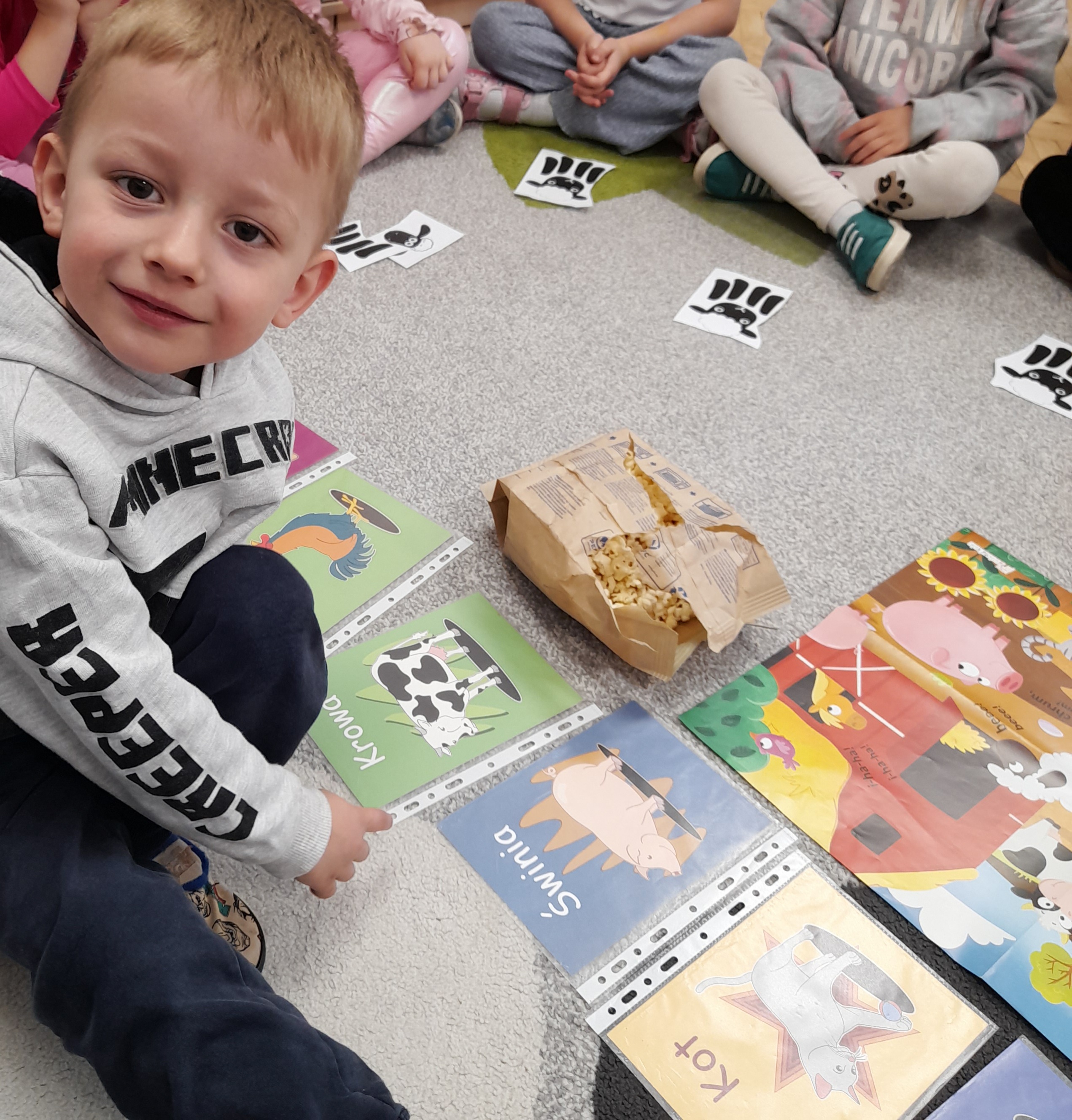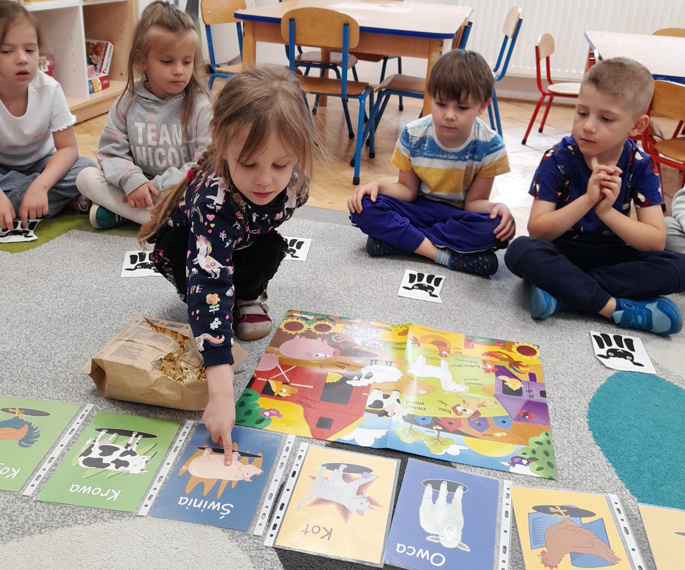 Rozmawiamy o zwierzętach z gospodarstwa wiejskiego - nazywamy je, rozmawiamy o ich domach, miejscach odpoczynku. Dzielimy nazwy na sylaby, określamy liczbę sylab w wyrazach.