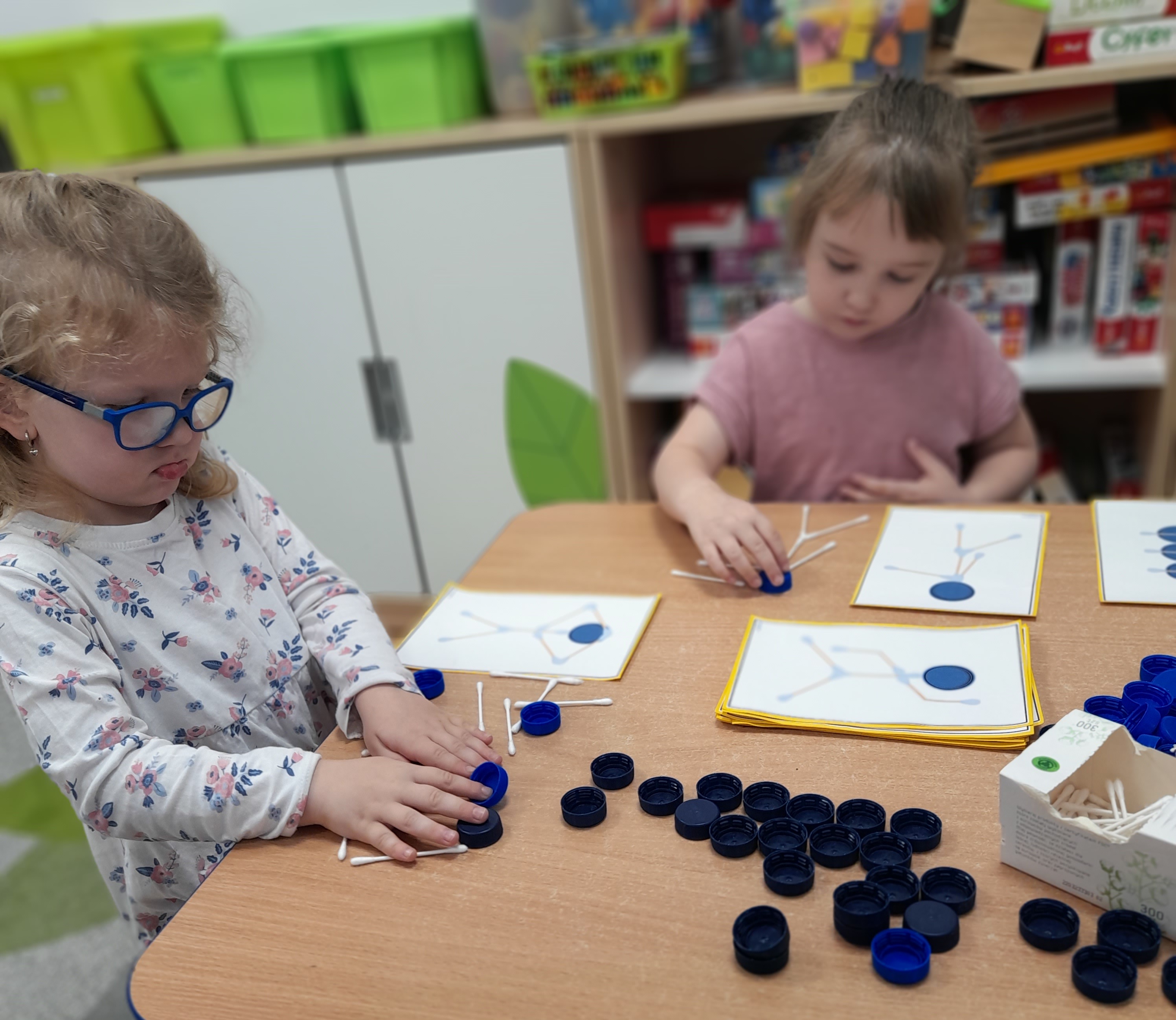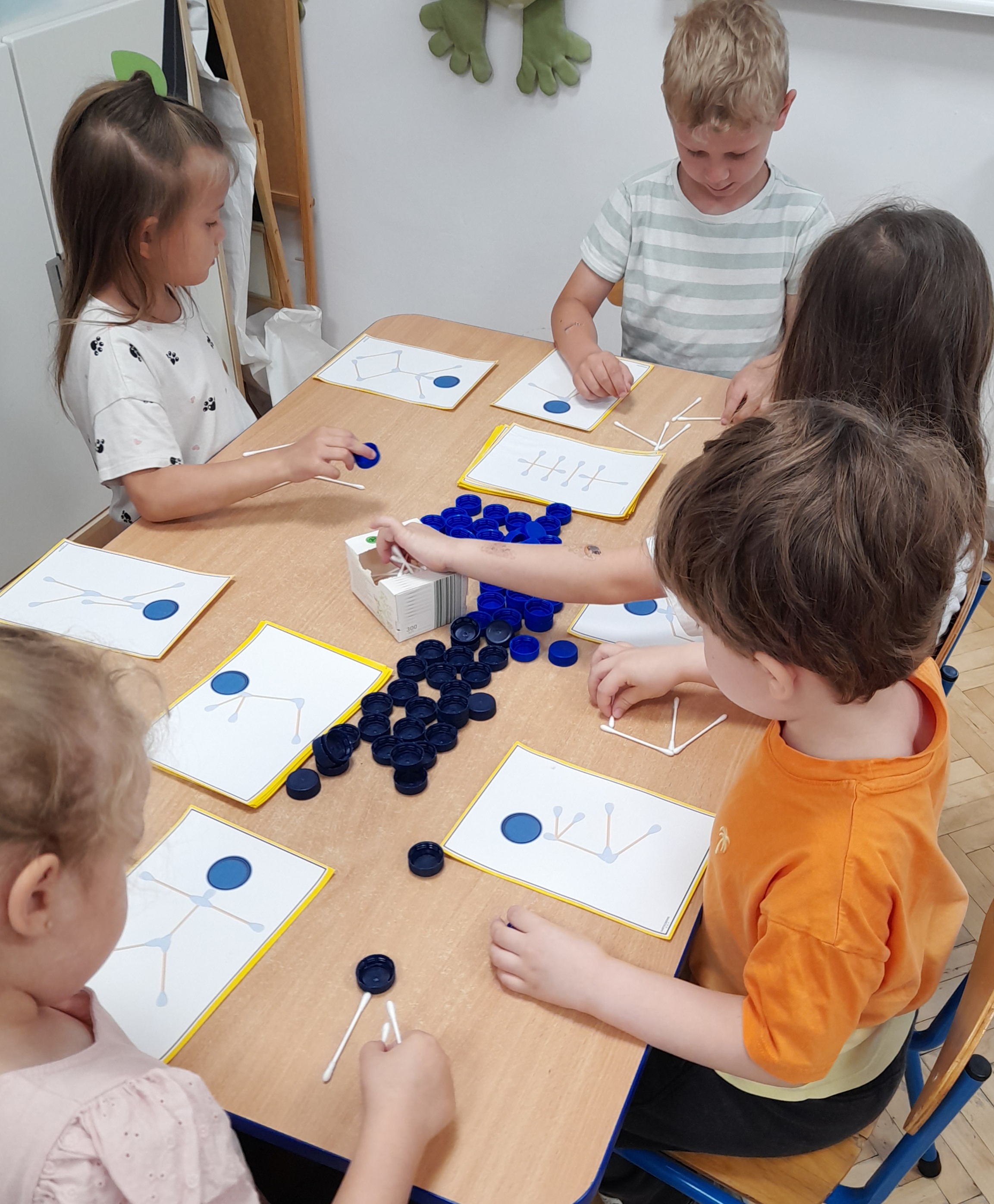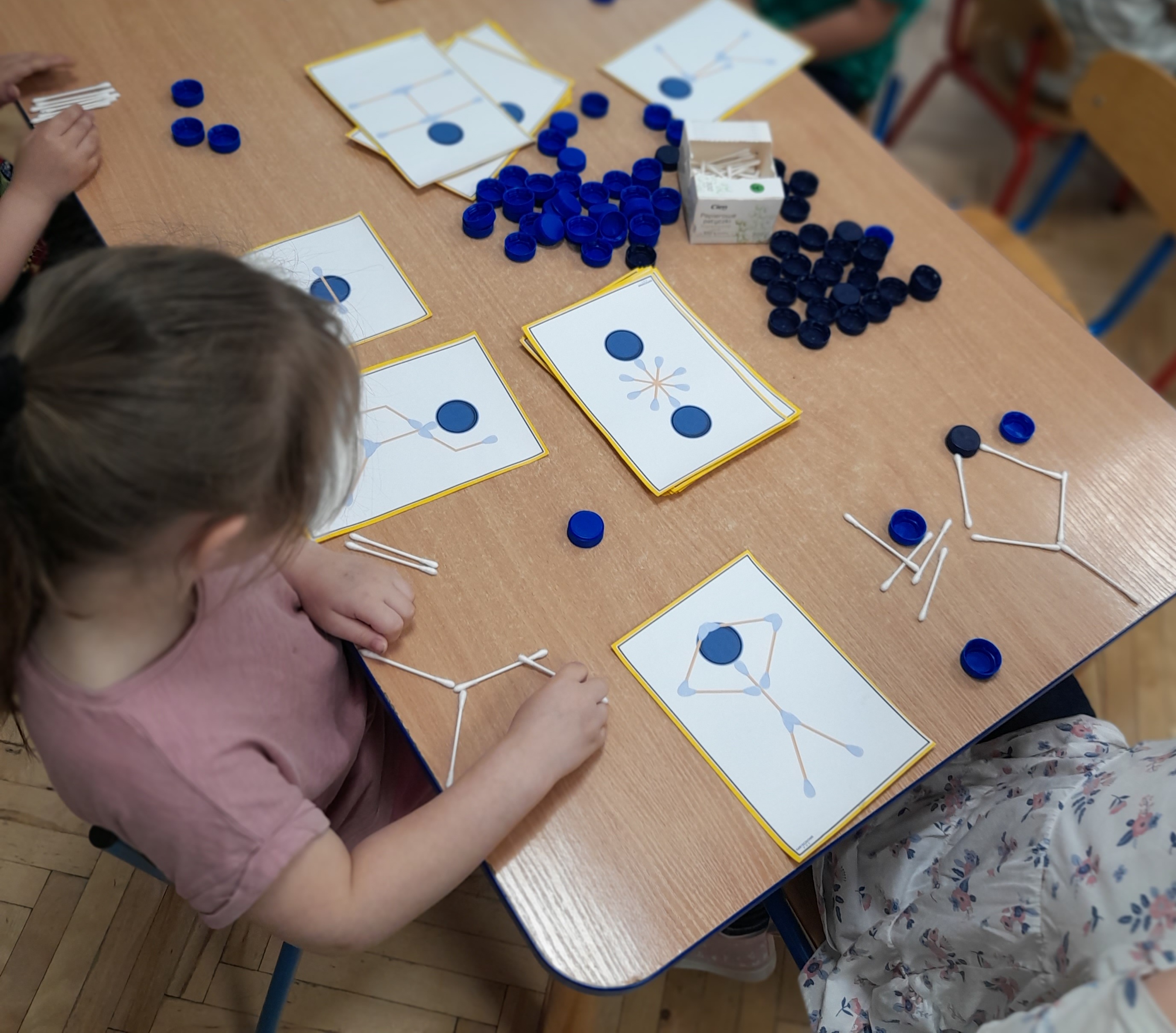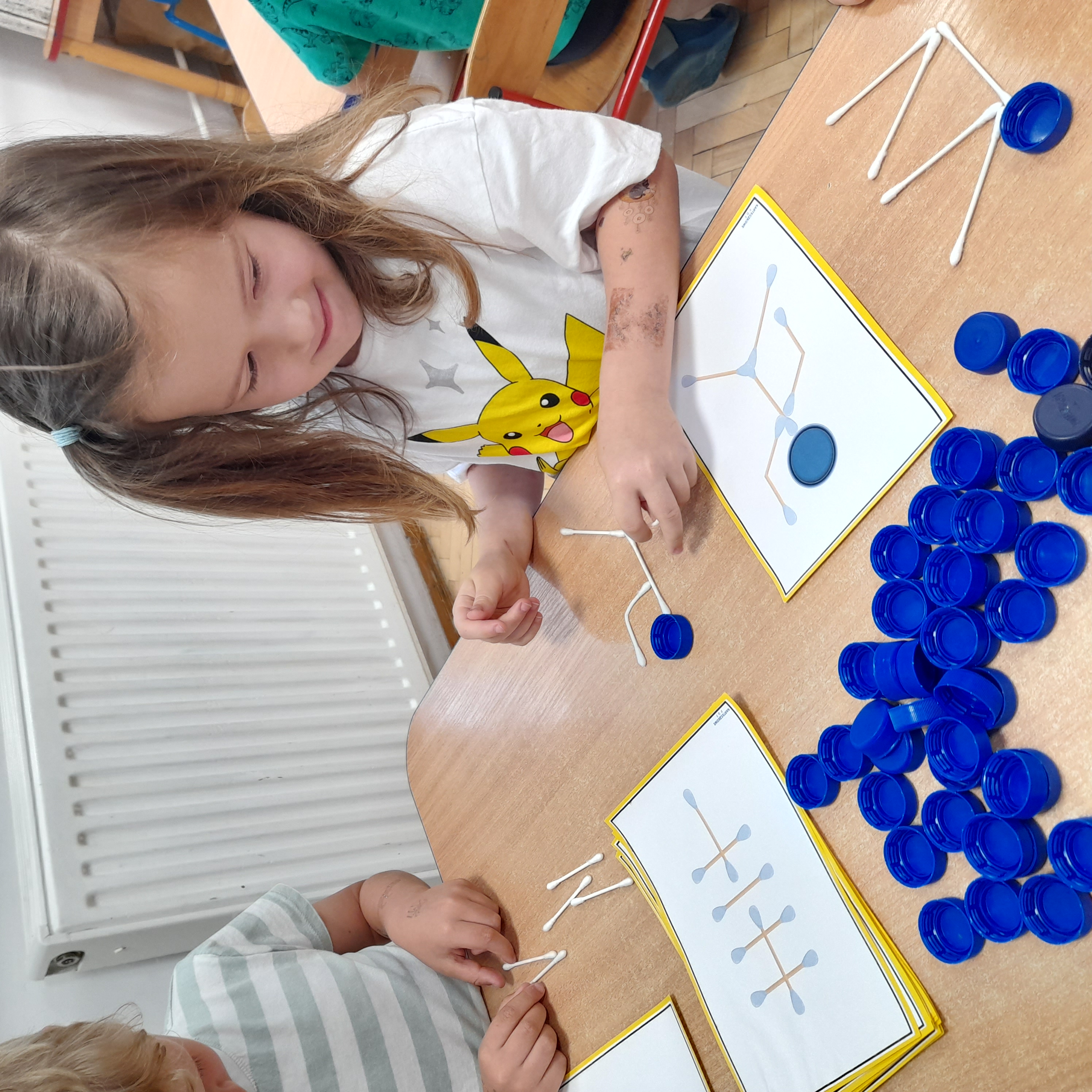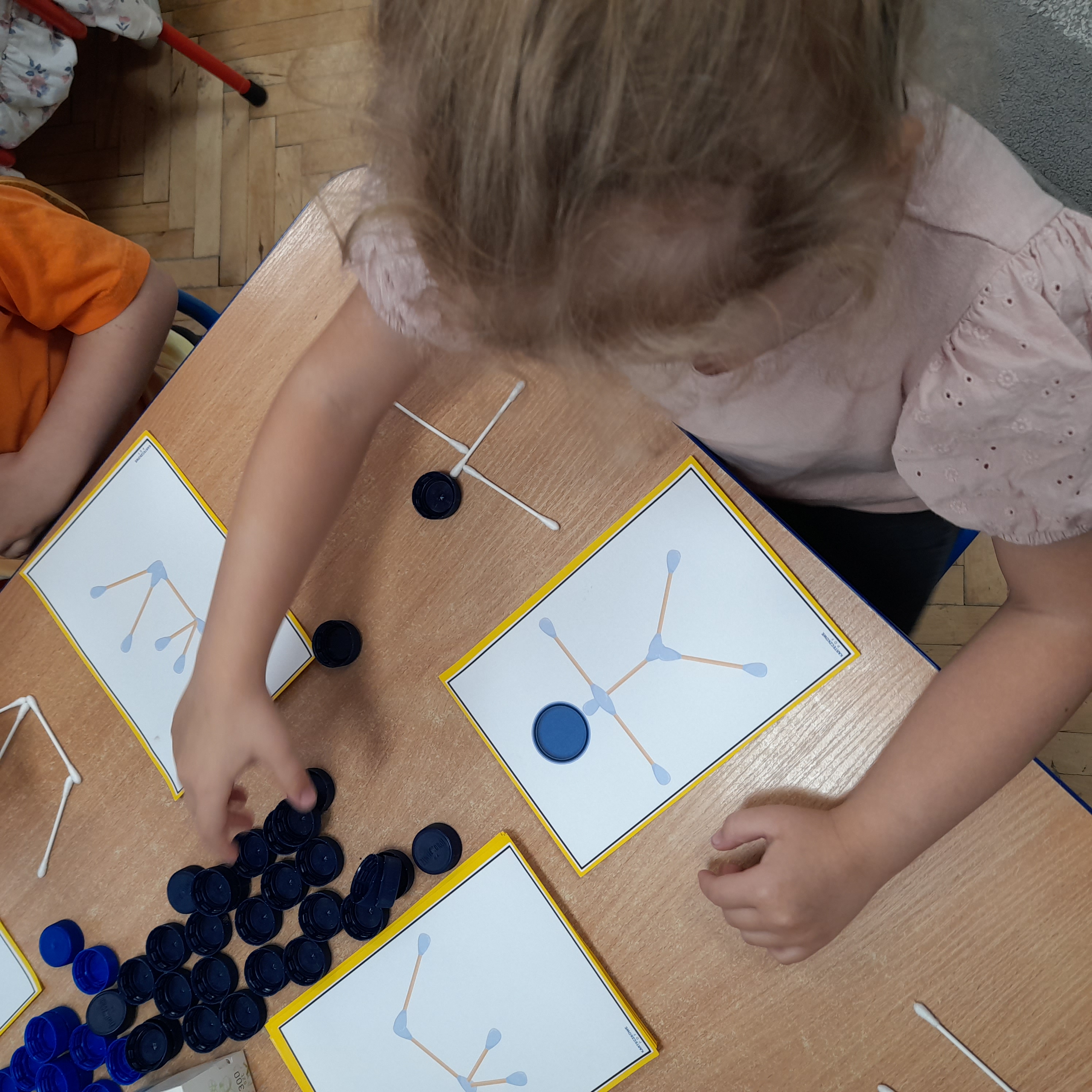 Zabawy z patyczkami i zakrętkami - zabawy rozwijające umiejętności: odwzorowywania, koordynacji wzrokowo-ruchowej oraz skupienia uwagi - Żabki.