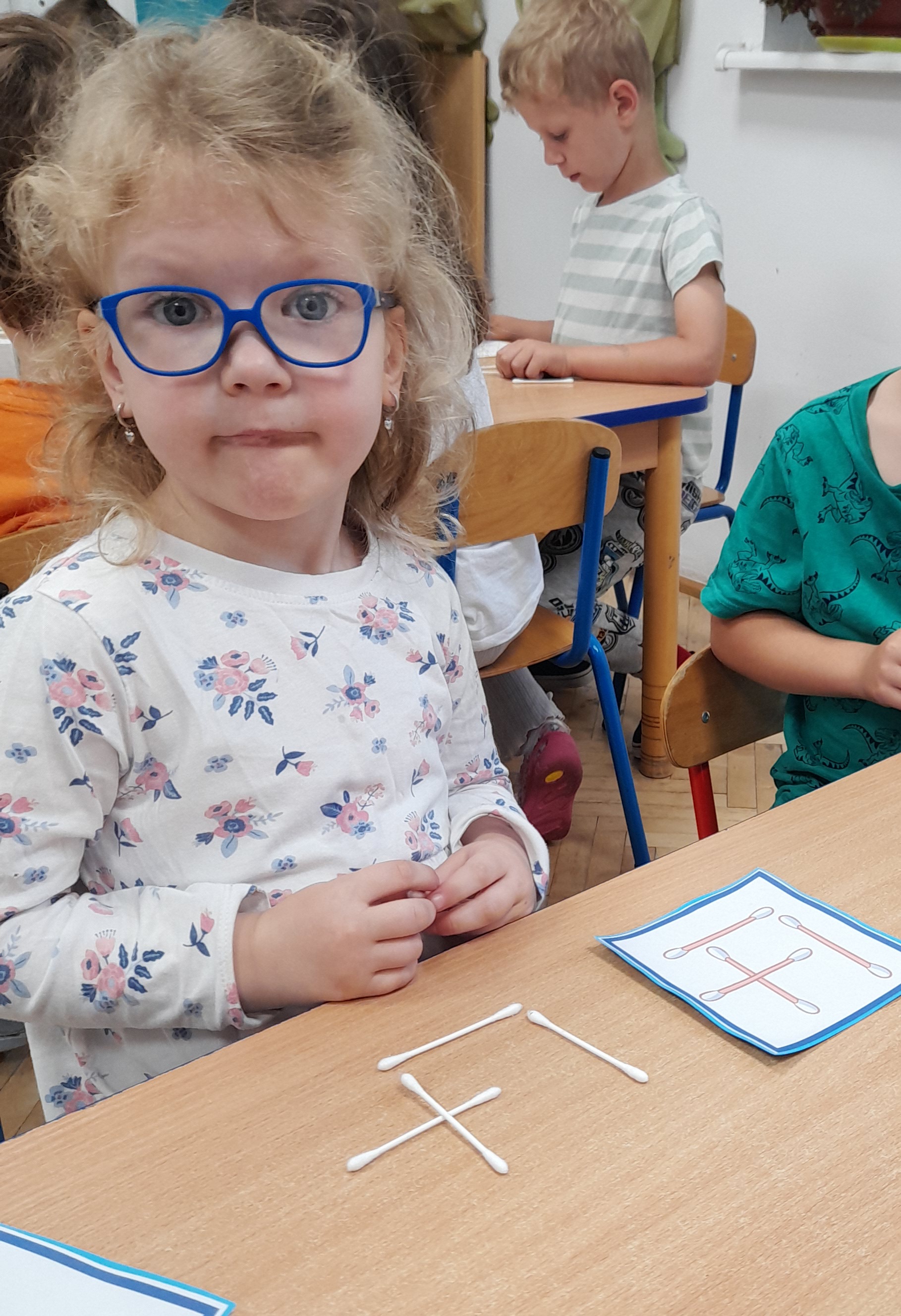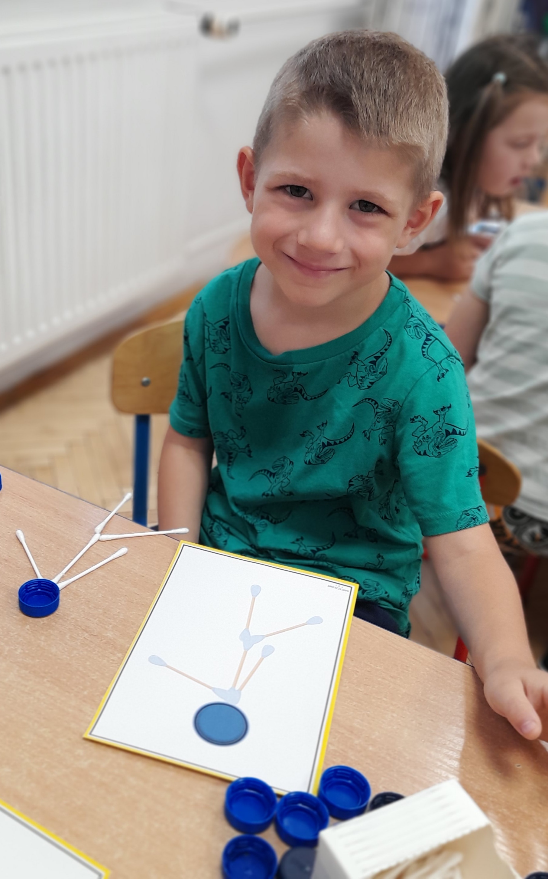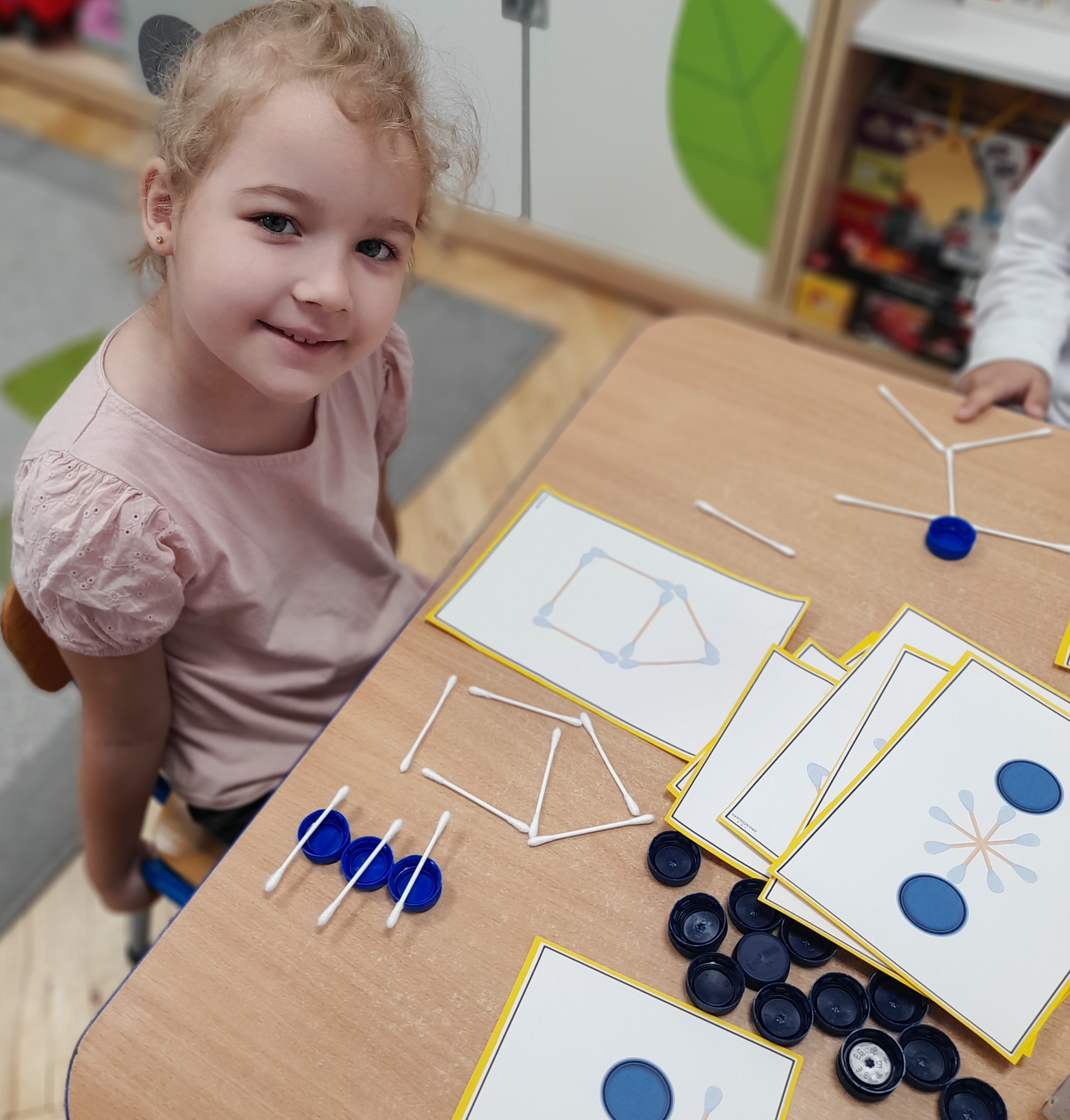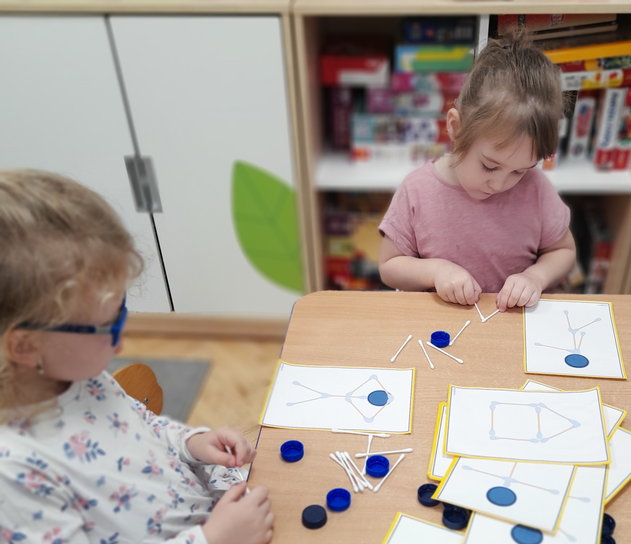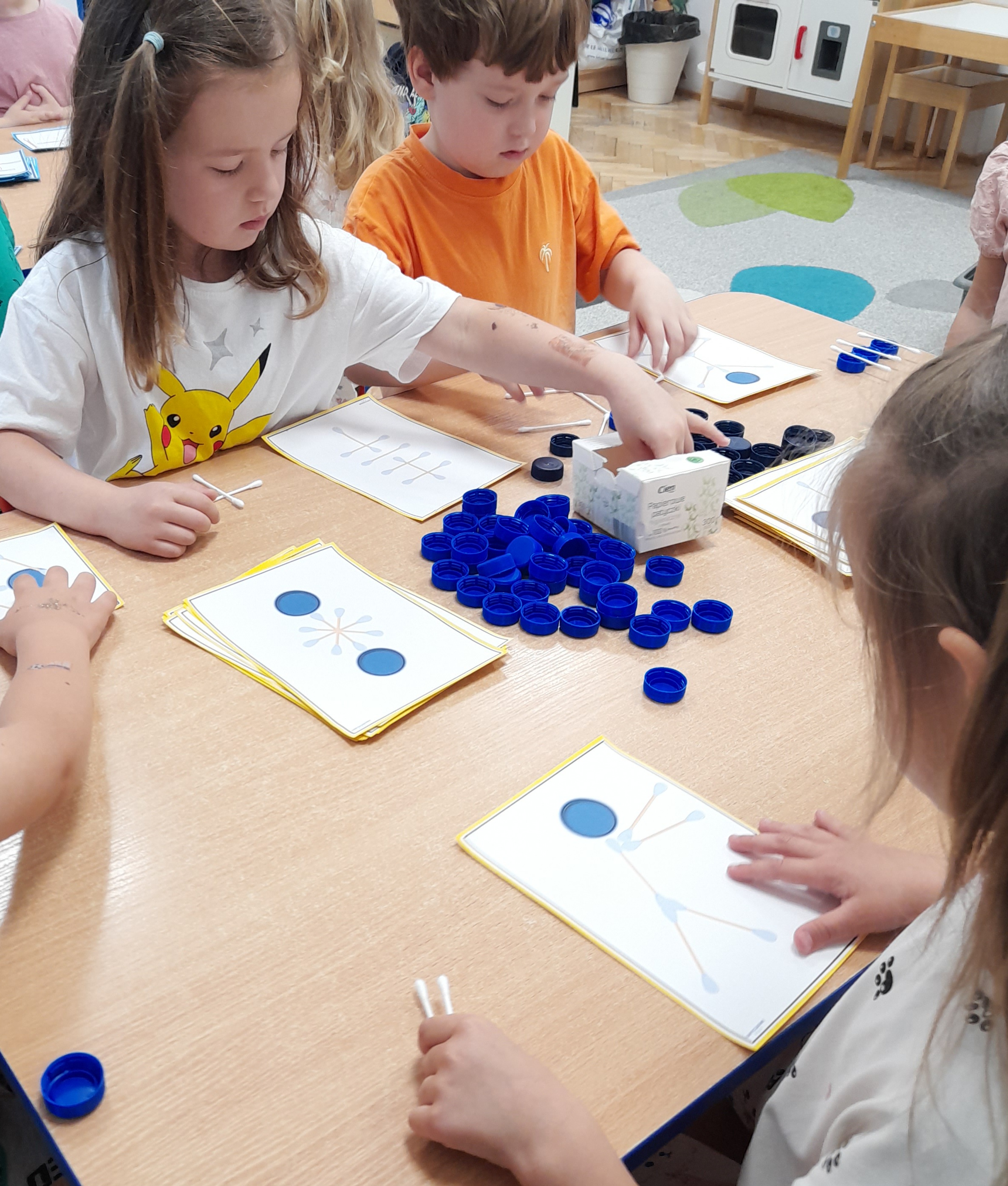 Zabawy z patyczkami i zakrętkami - zabawy rozwijające umiejętności: odwzorowywania, koordynacji wzrokowo-ruchowej oraz skupienia uwagi - Żabki.