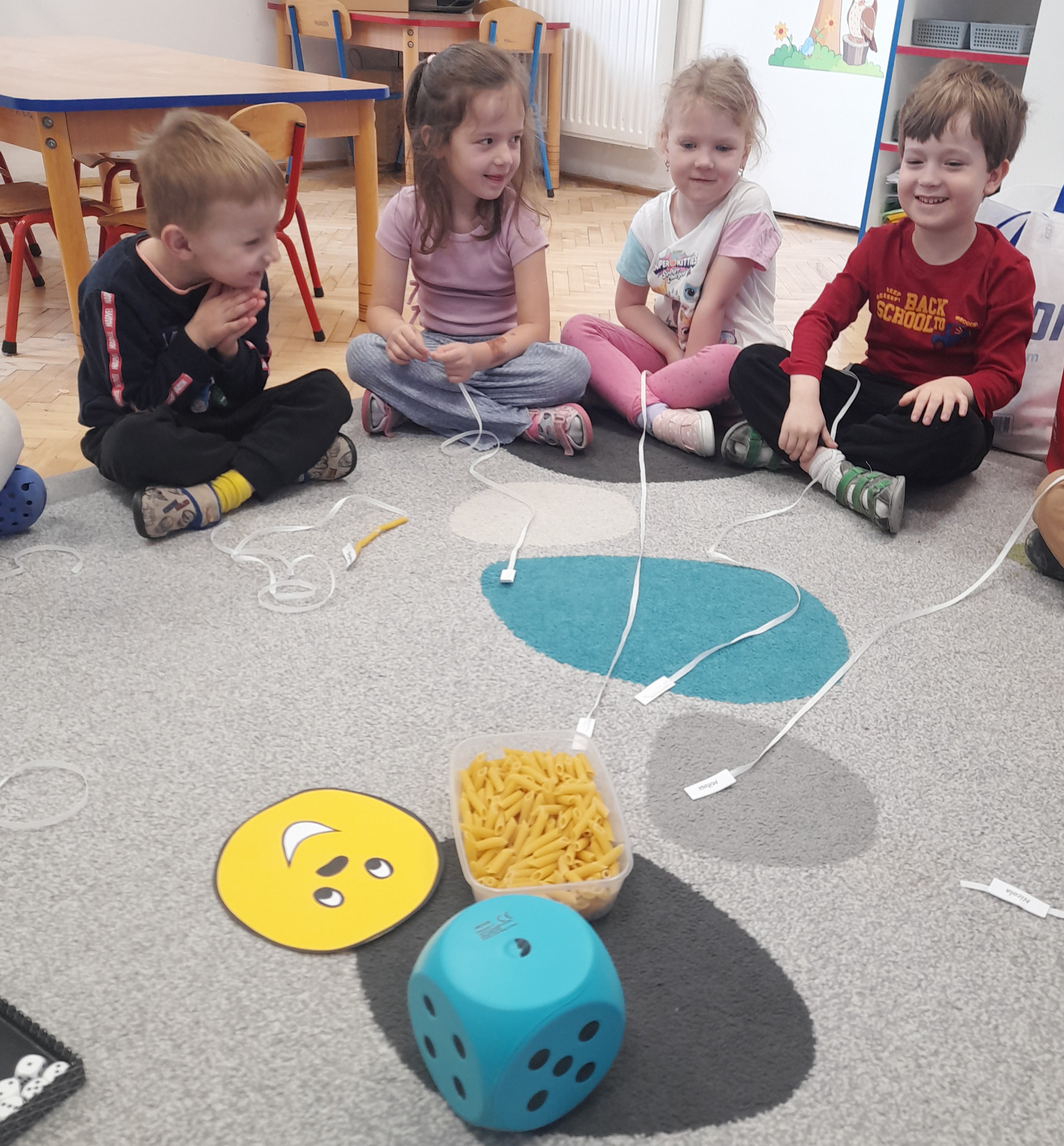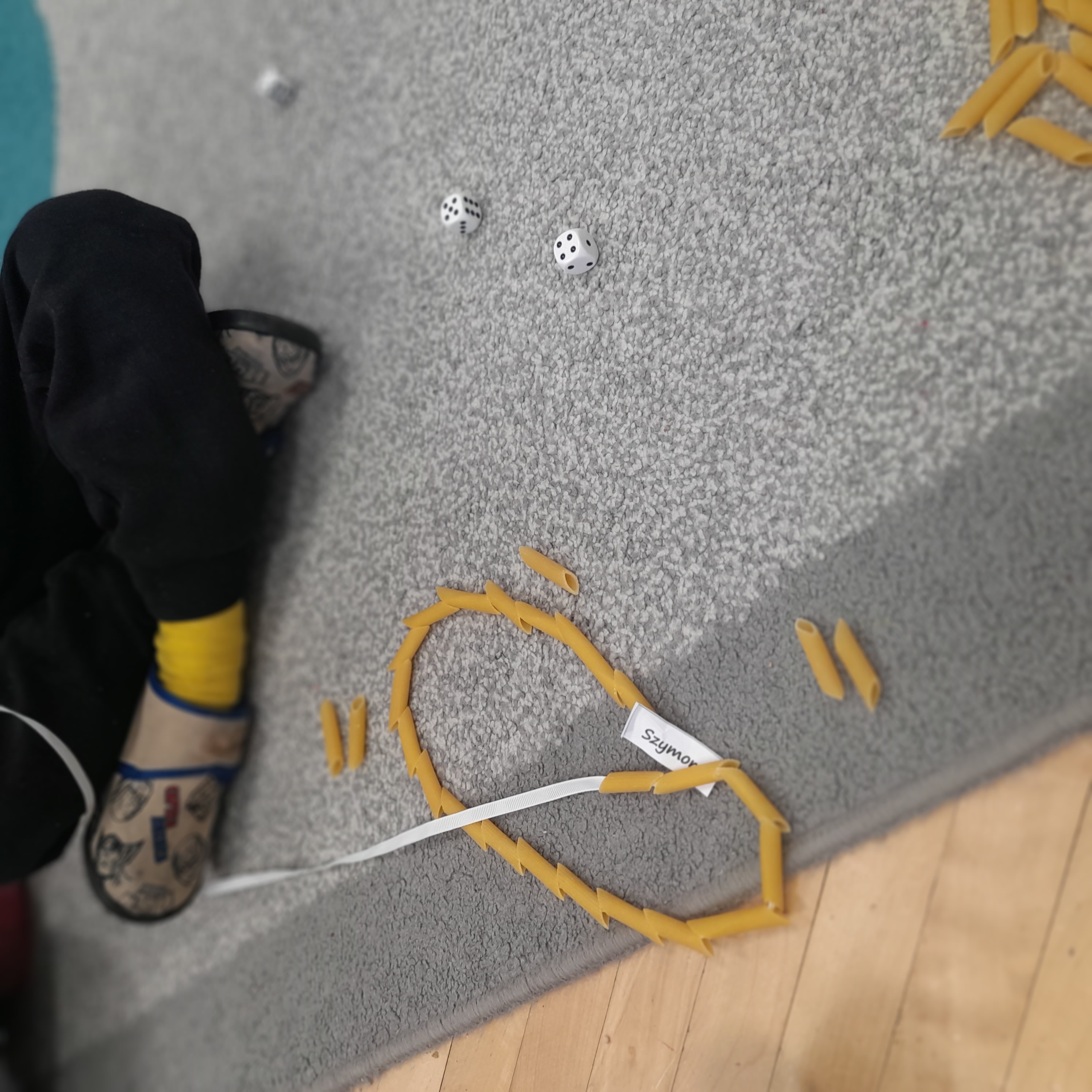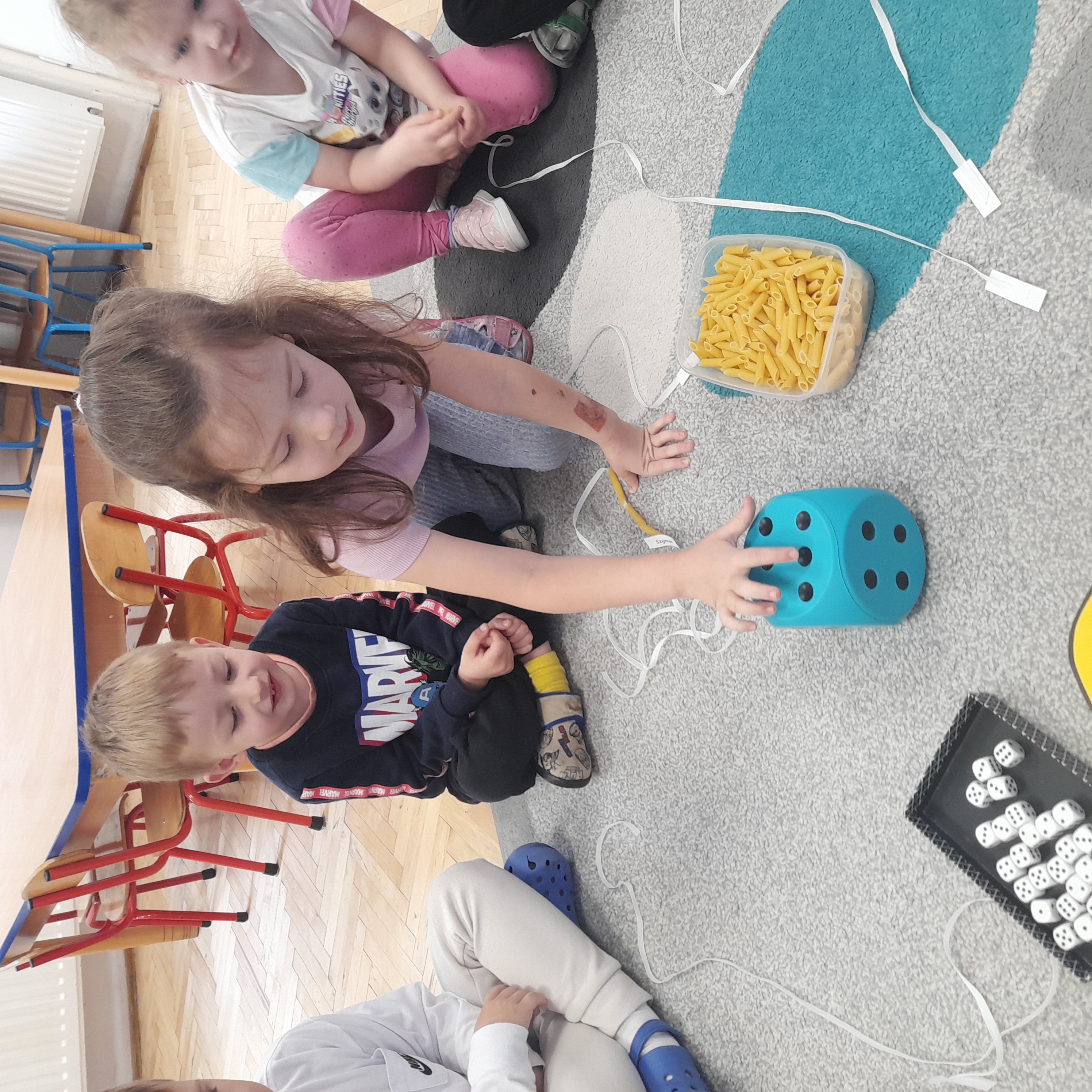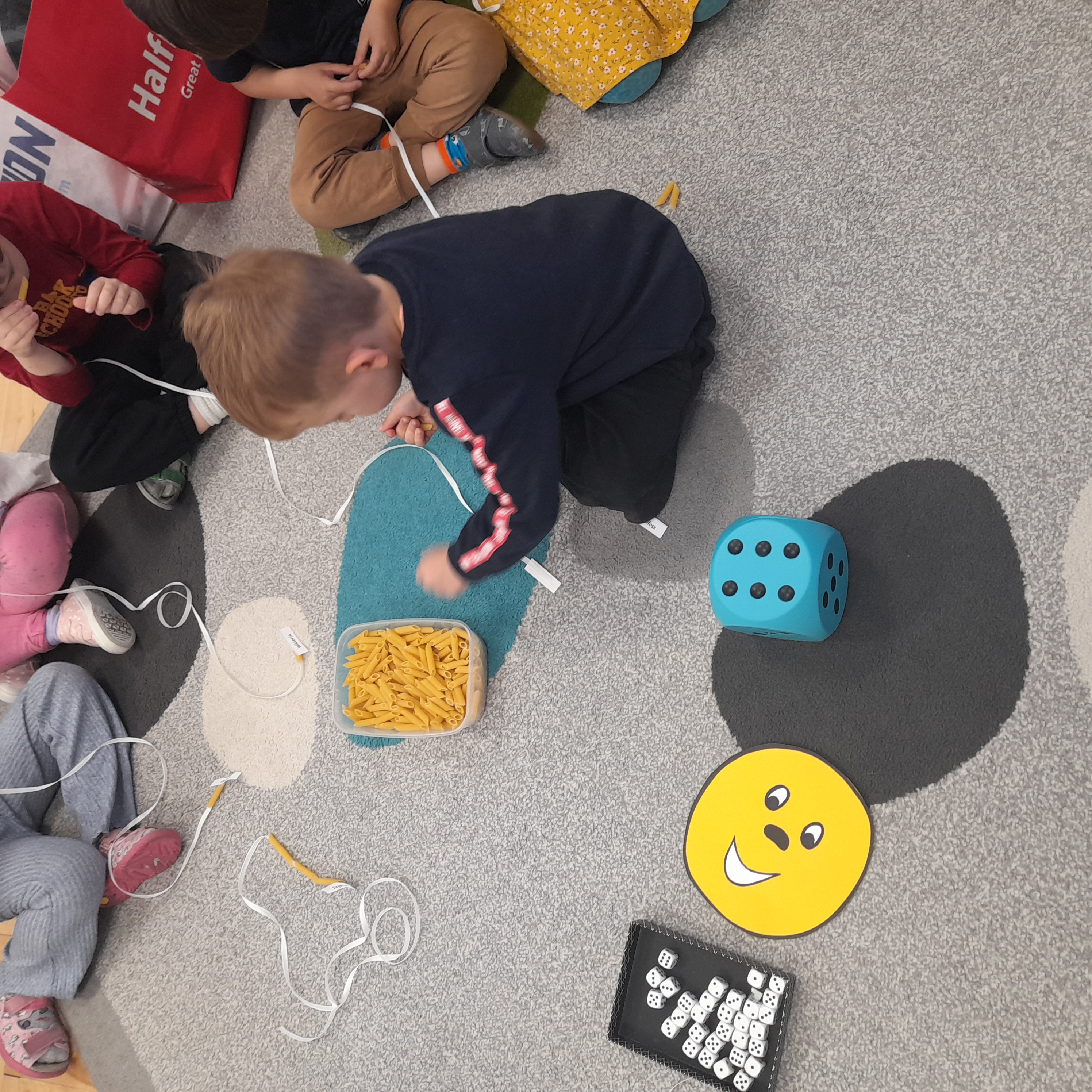 Nasza zabawa makaronowo-matematyczna polega na tym, aby nawlec na sznurek tyle makaronów, ile wskazuje liczba oczek na kostce. Dodatkowo, ćwiczy koncentrację i skupienie uwagi oraz rozwija sprawność dłoni i palców niezbędną do podjęcia nauki w szkole podstawowej.