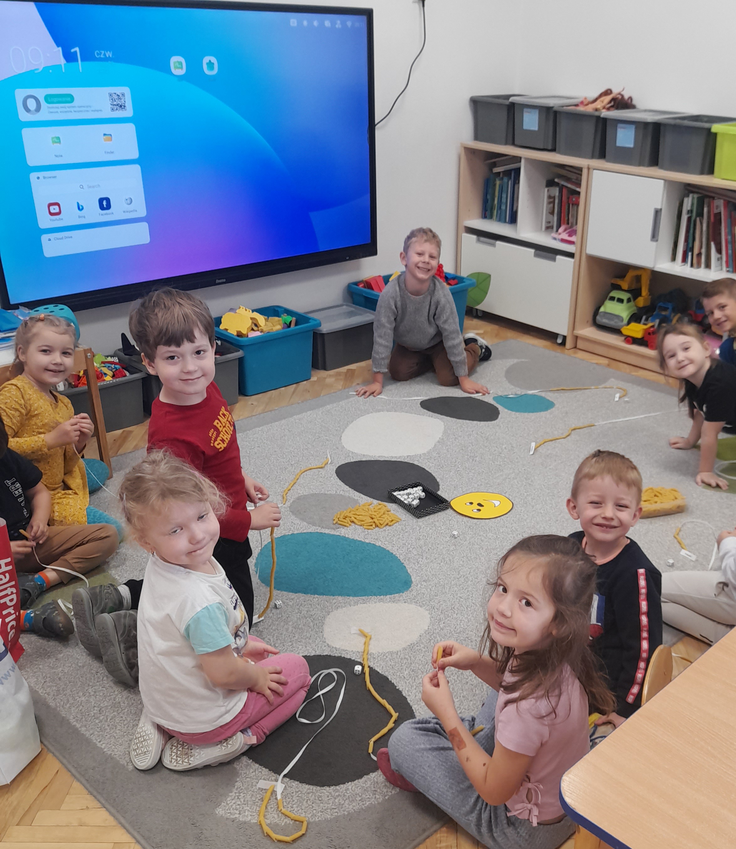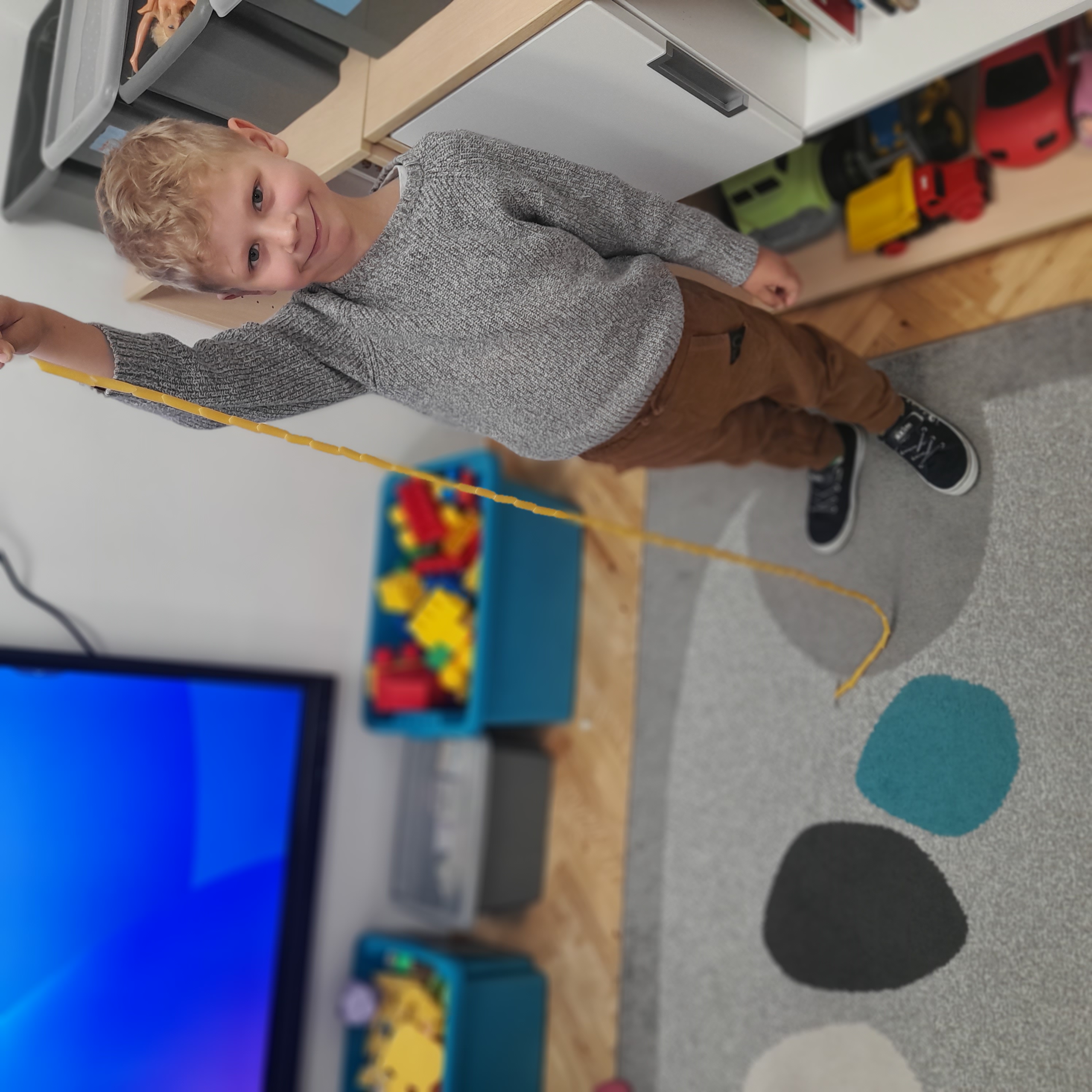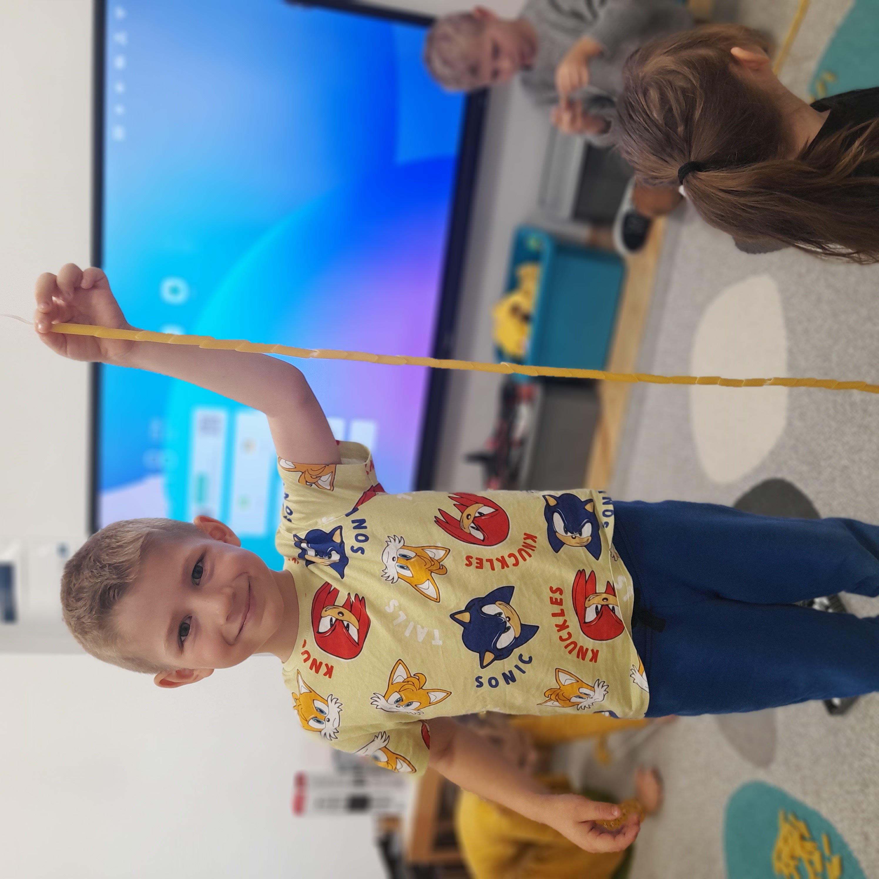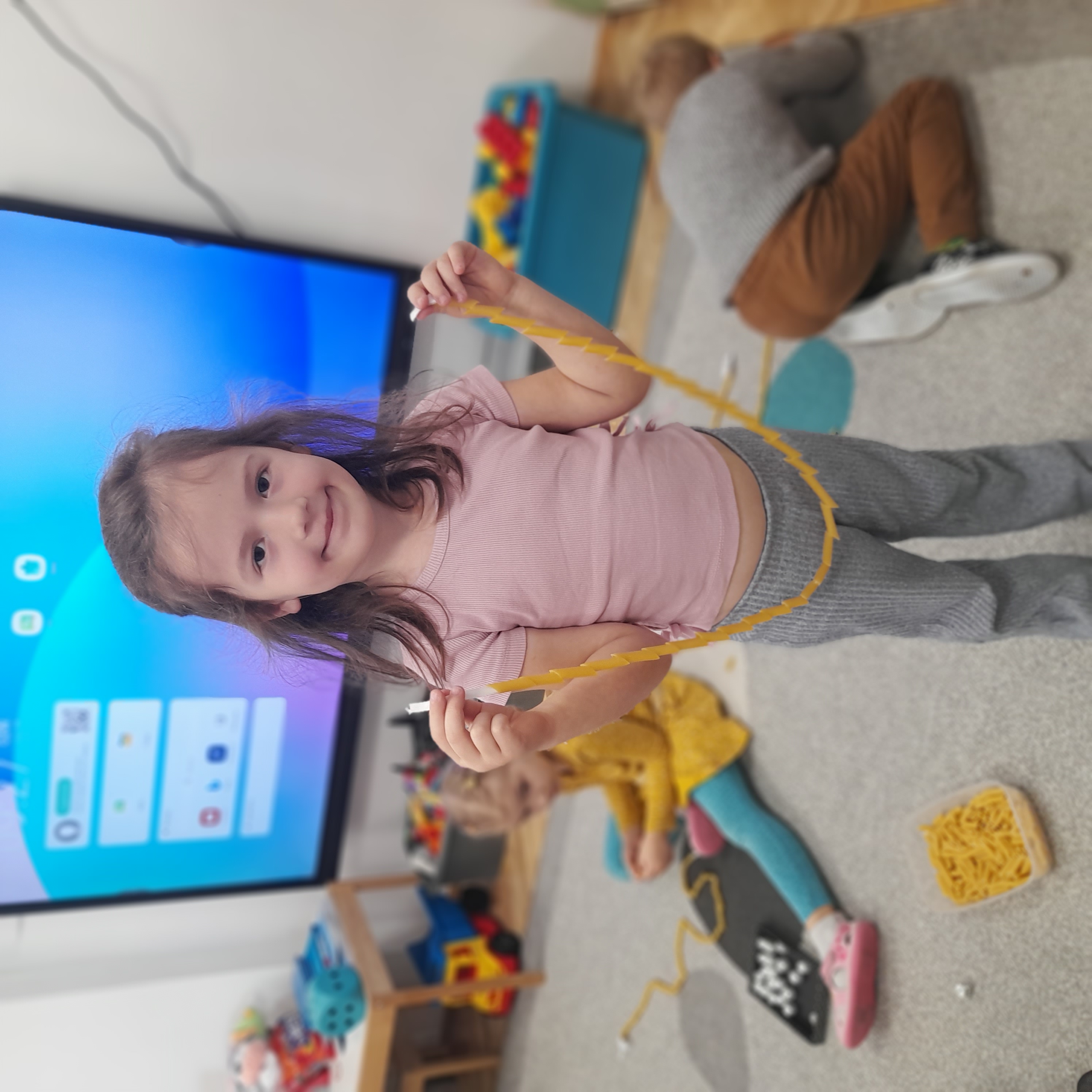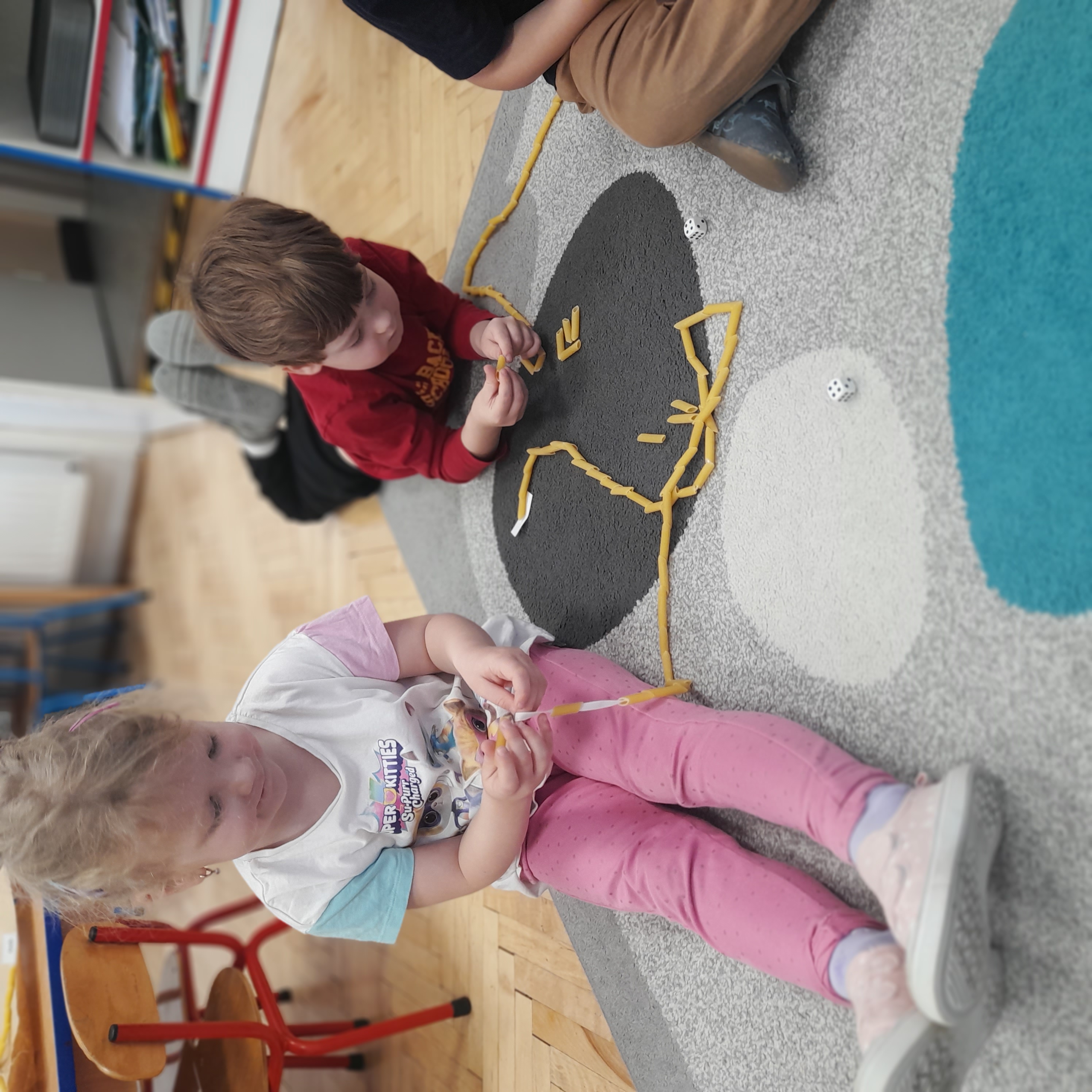 Nasza zabawa makaronowo-matematyczna polega na tym, aby nawlec na sznurek tyle makaronów, ile wskazuje liczba oczek na kostce. Dodatkowo, ćwiczy koncentrację i skupienie uwagi oraz rozwija sprawność dłoni i palców niezbędną do podjęcia nauki w szkole podstawowej.