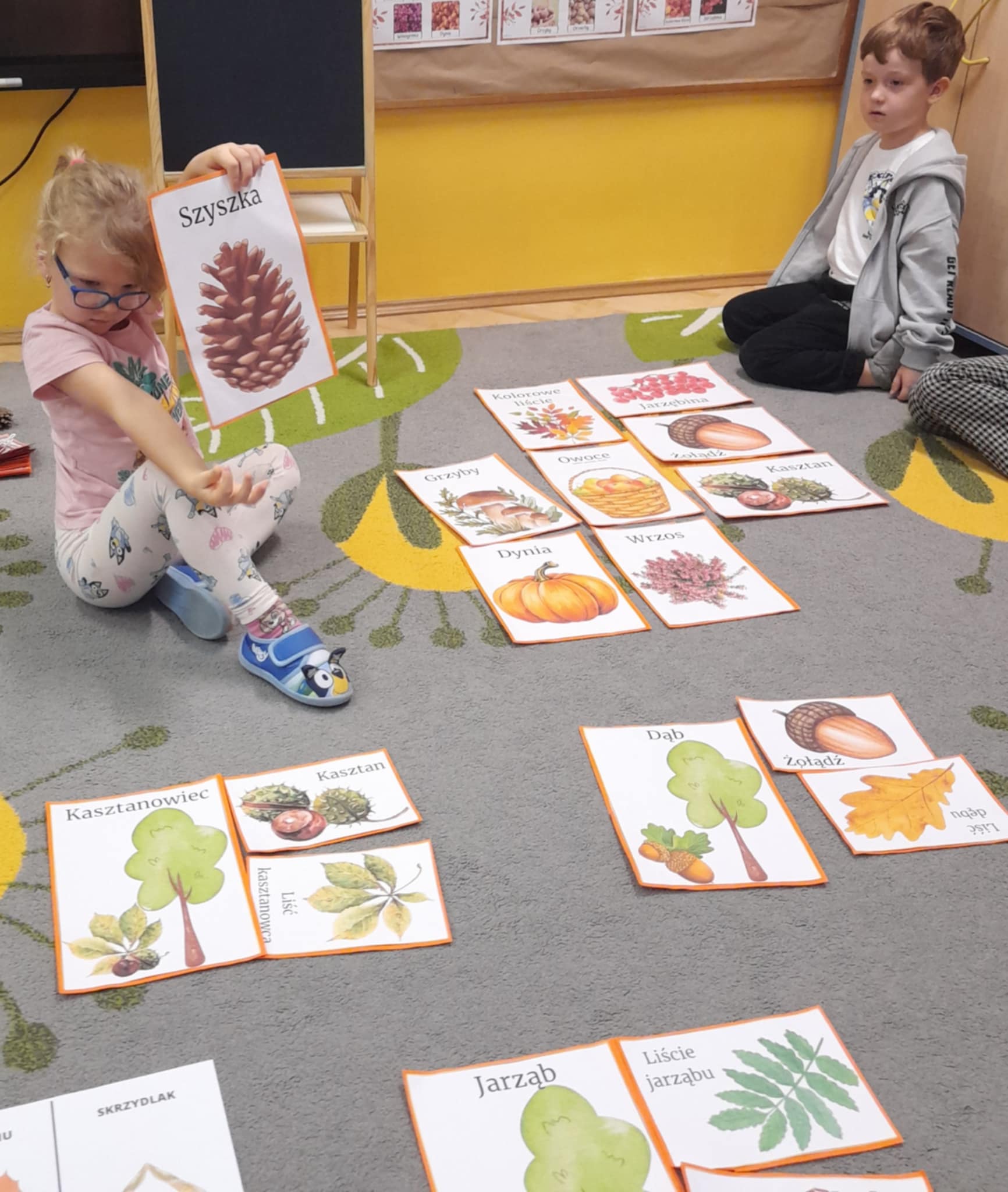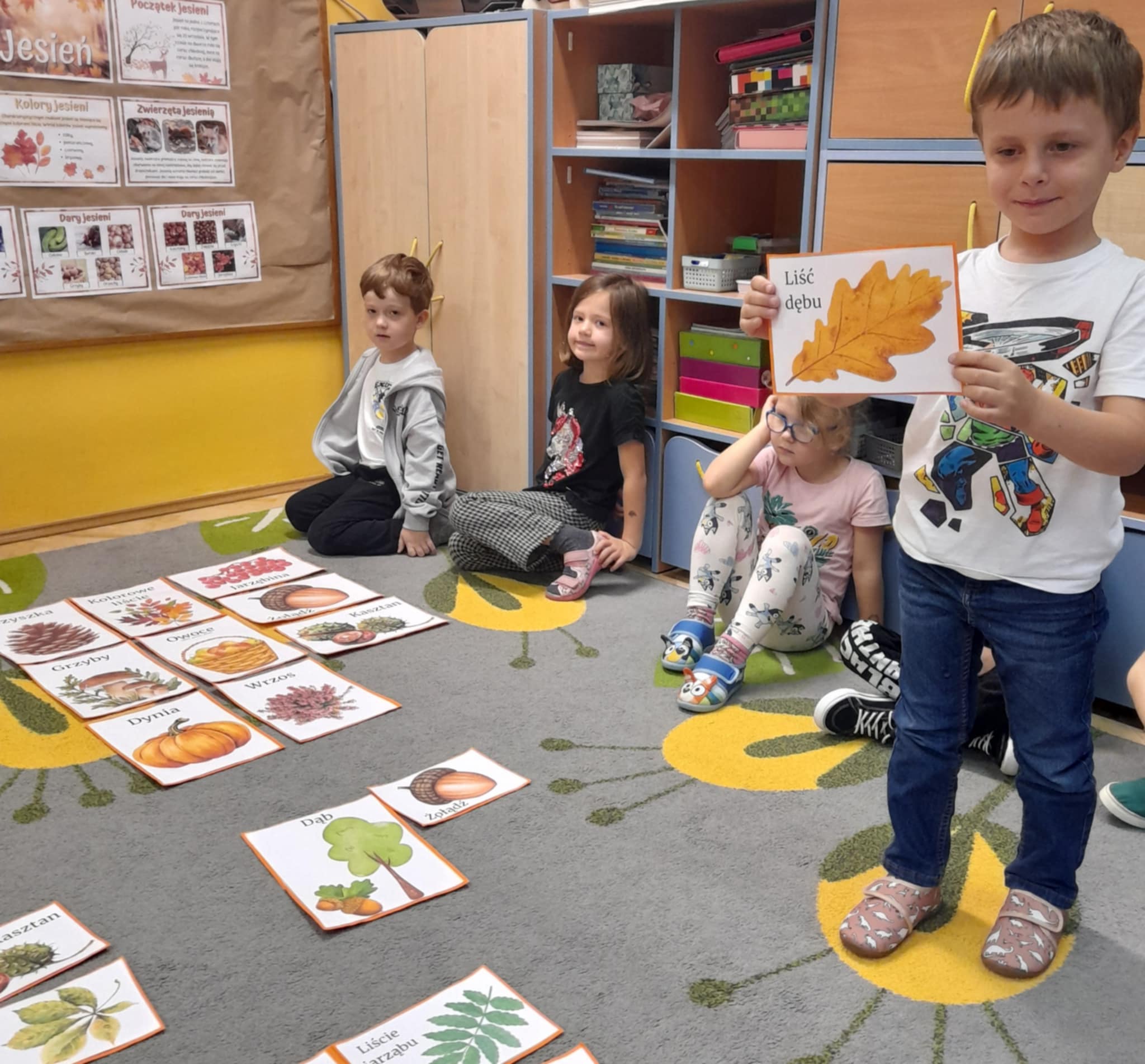 Poznajemy uroki jesieni, rozmawiamy o zmianach zachodzacych w przyrodzie. Potrafimy nazwac drzewa: DAB, KASZTANOWIEC, JARZAB oraz wskazac owoce: ZOLEDZIE, KASZTANY, JARZEBINA.