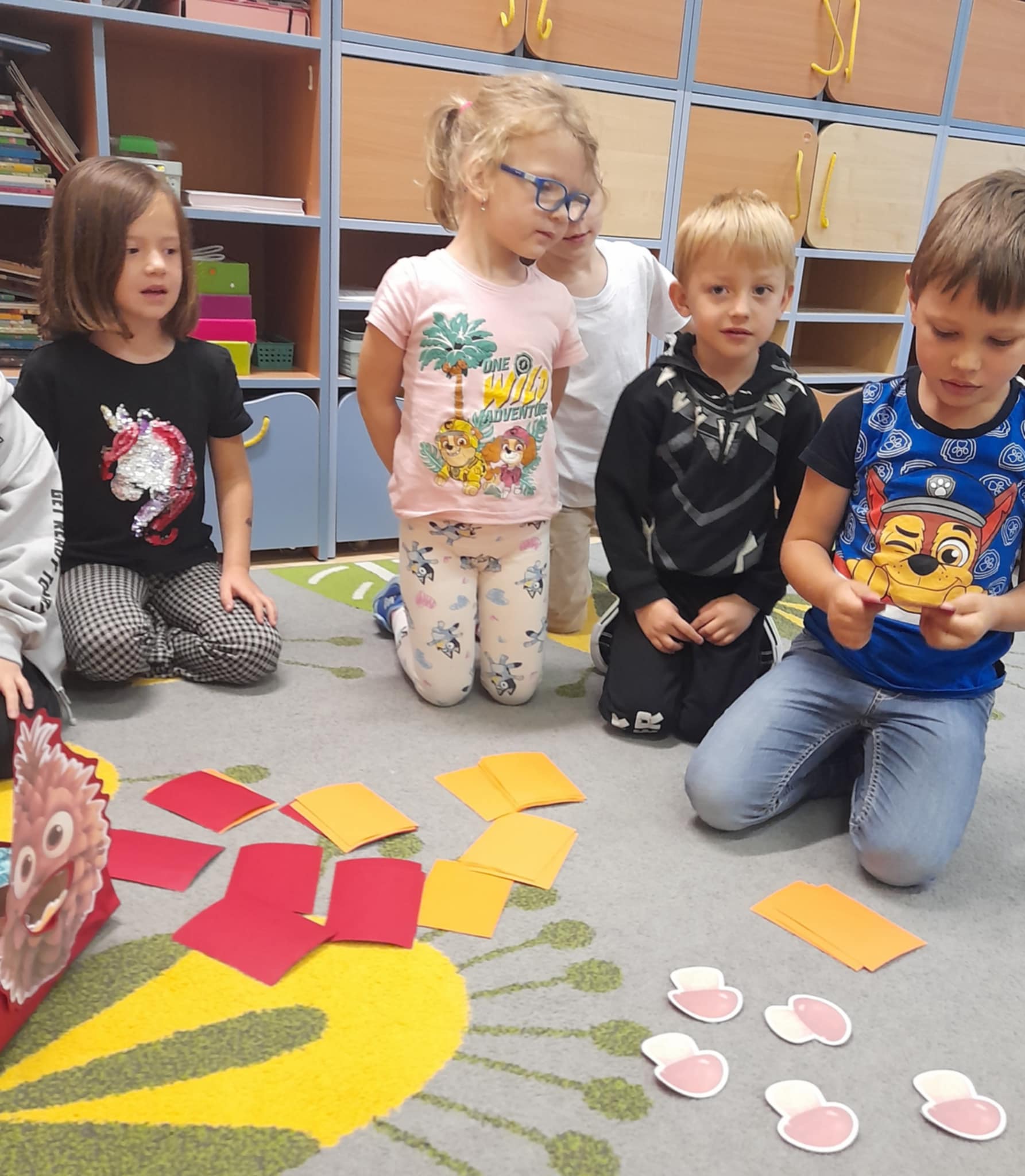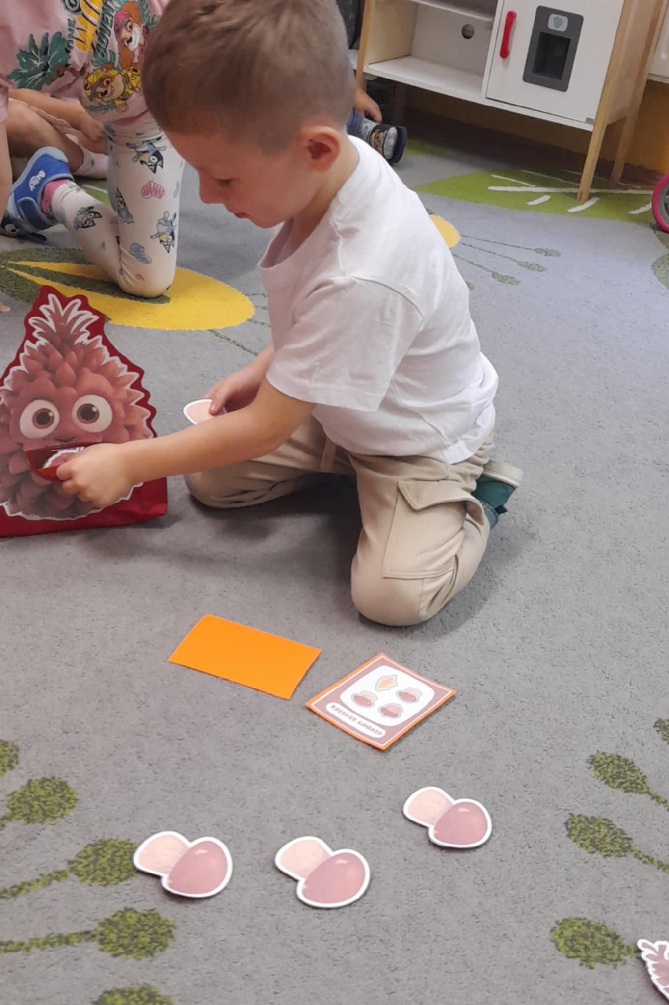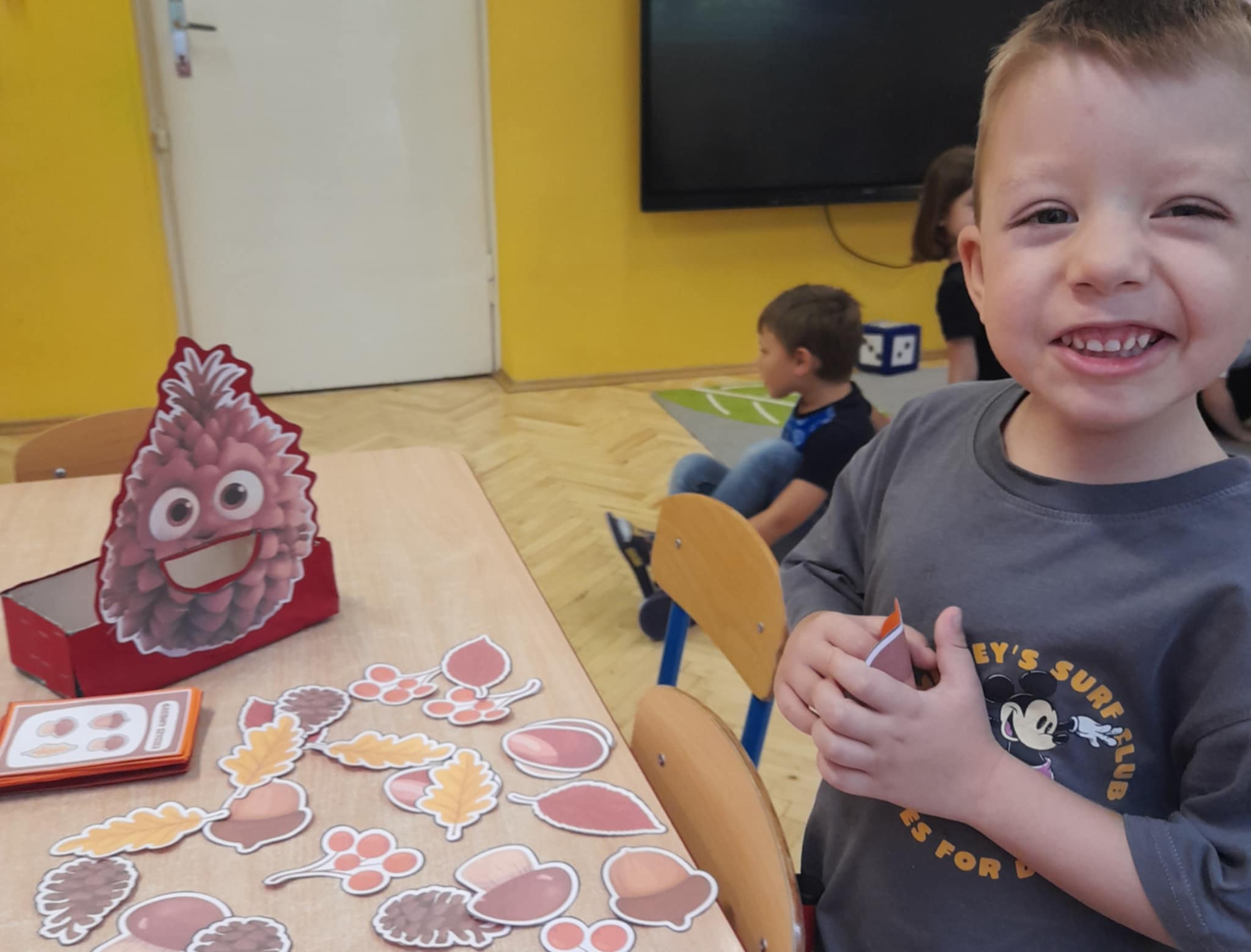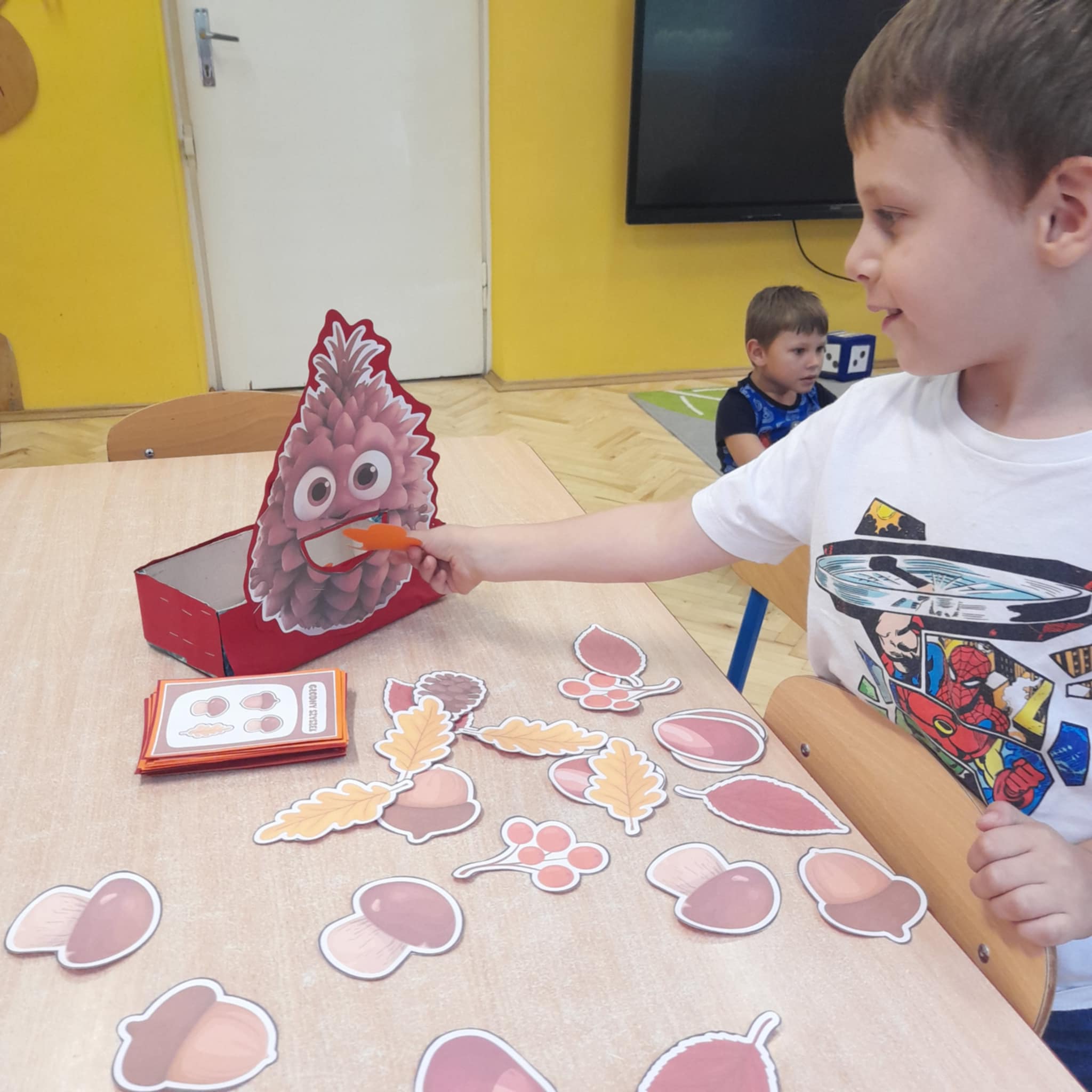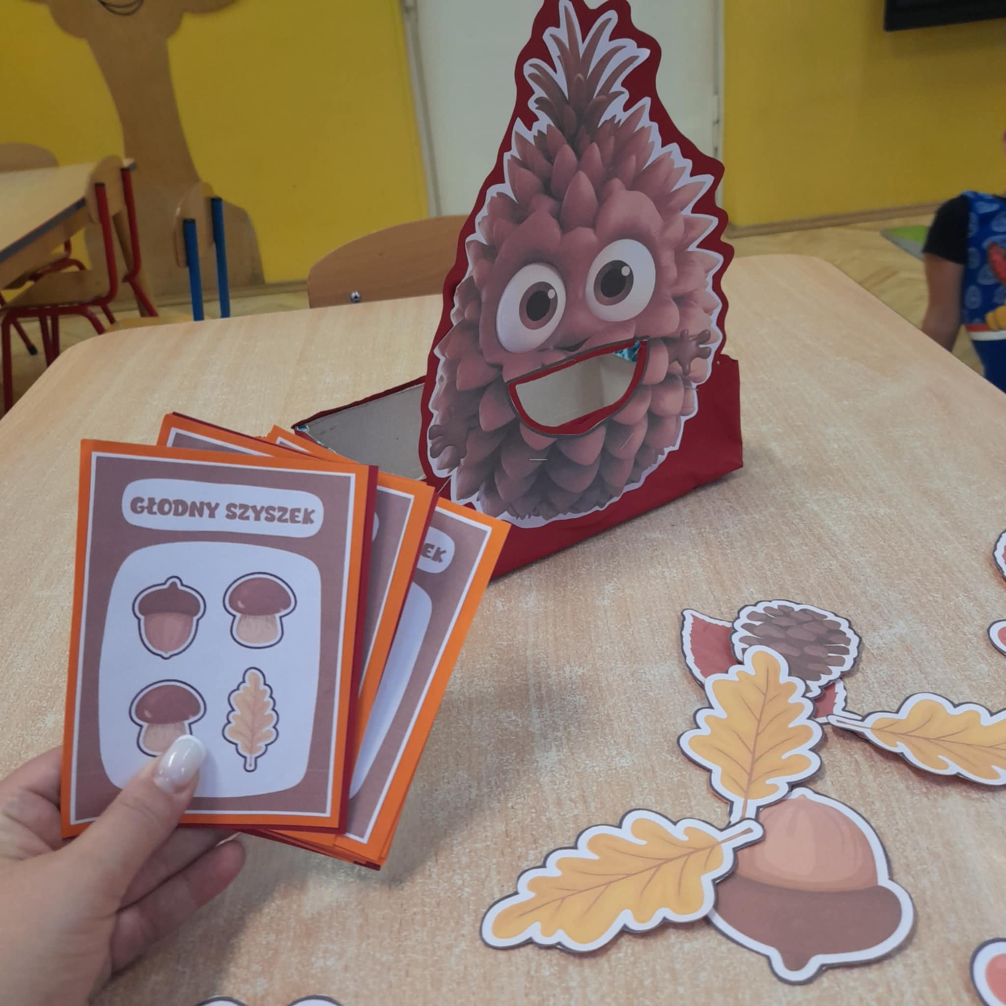 To fantastyczna zabawa matematyczna polegajaca na odliczaniu tylu darow jesieni - kasztanow, zoledzi, listkow - ile wskazuje liczba oczek na kostce. Mozna bawic sie rowniez z zakodowanymi obrazkami, na ktorych graficznie przedstawiona jest informacja, co takiego Szyszek ma ochote zjeść.