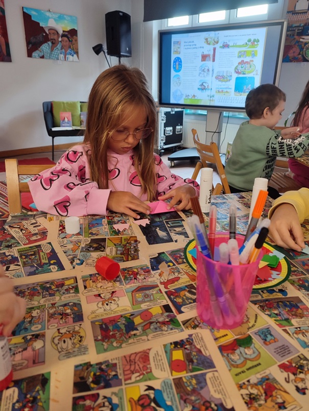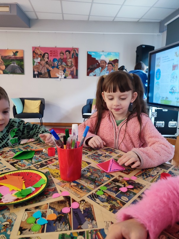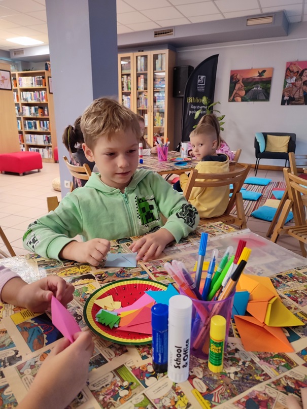 Dzieci z grupy Motylki odwiedziły Miejską Bibliotekę Publiczną, Filię nr 3 w Katowicach. Celem naszej wizyty było rozbudzenie zainteresowania literaturą dziecięcą oraz zachęcenie najmłodszych do sięgania po książki nie tylko w przedszkolu, ale również w domu.Podczas spotkania dzieci poznały wyjątkową historię dziewczynki o imieniu Michalina, która choć książek nie lubiła i wykorzystywała je do zabawy, pewnego dnia przekonała się, jak niezwykłe przygody można w nich odkryć. Opowieść „Pewnego razu była sobie dziewczynka o imieniu Michalina...” rozbudziła wyobraźnię naszych małych słuchaczy i stała się doskonałym pretekstem do rozmów o tym, czym są książki, jak o nie dbać oraz dlaczego warto czytać.Na zakończenie zajęć dzieci miały okazję stworzyć własne, nietypowe zakładki do książek kolorowe, kreatywne i pełne dziecięcej wyobraźni. Każda z nich była wyjątkowa.