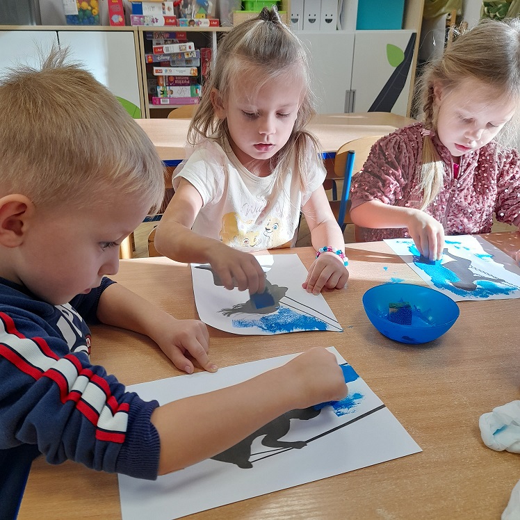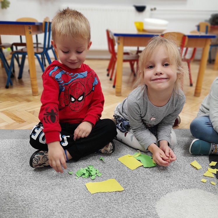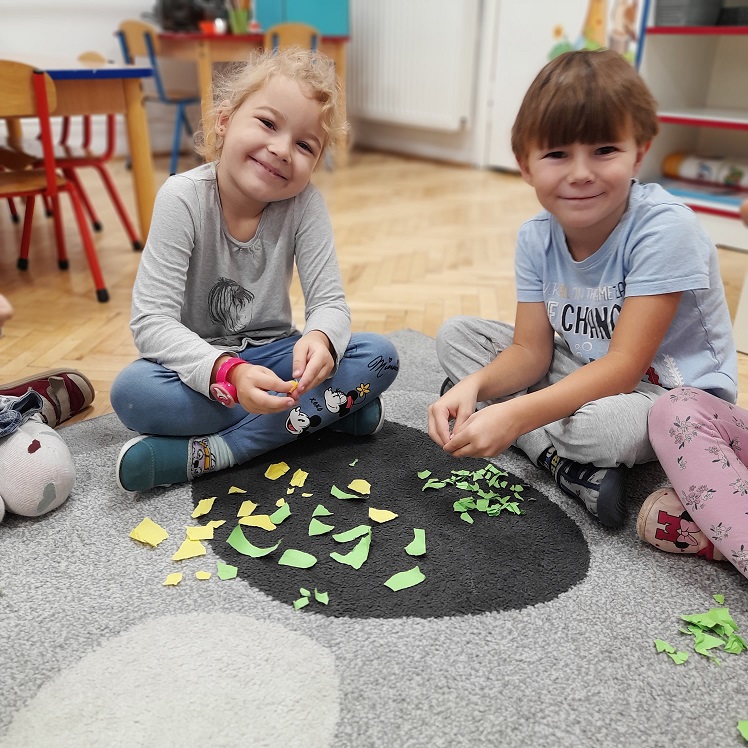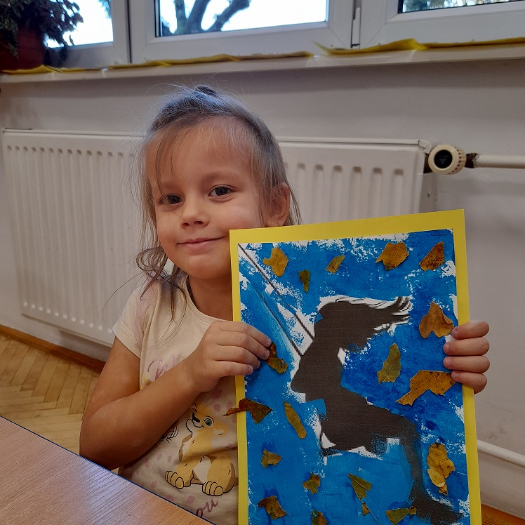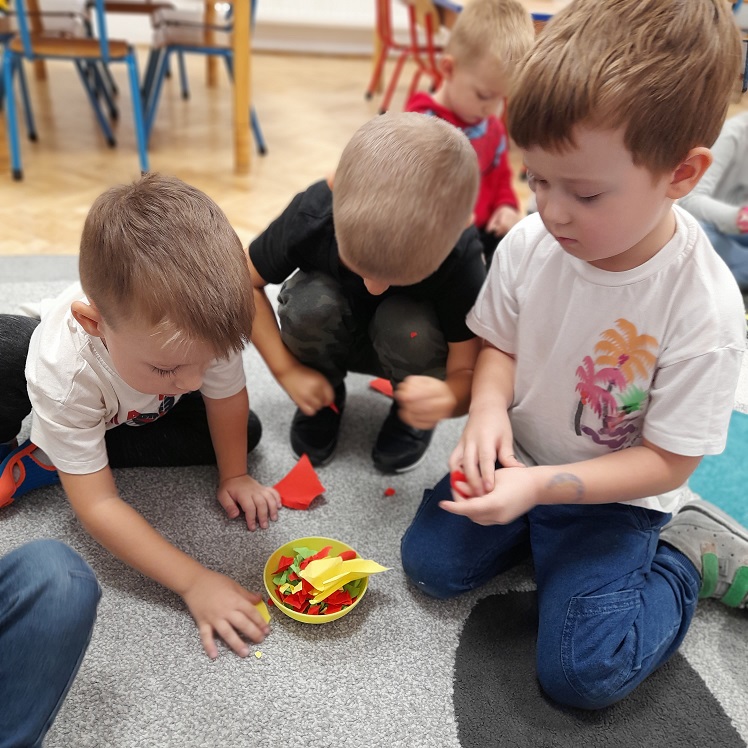 Rozmawiamy o jesieni - zmianach zachodzących w przyrodzie i pogodzie. Poznajemy nazwy drzew - dąb, kasztanowiec, jarząb, klon. Wspominamy o darach jesieni - żołędzie, kasztany, jarzębina, noski klonowe... Śpiewamy, tańczymy i bawimy się z jesienną muzyką. Malujemy, kolorujemy, wyklejamy, bawimy się barwami jesieni :)